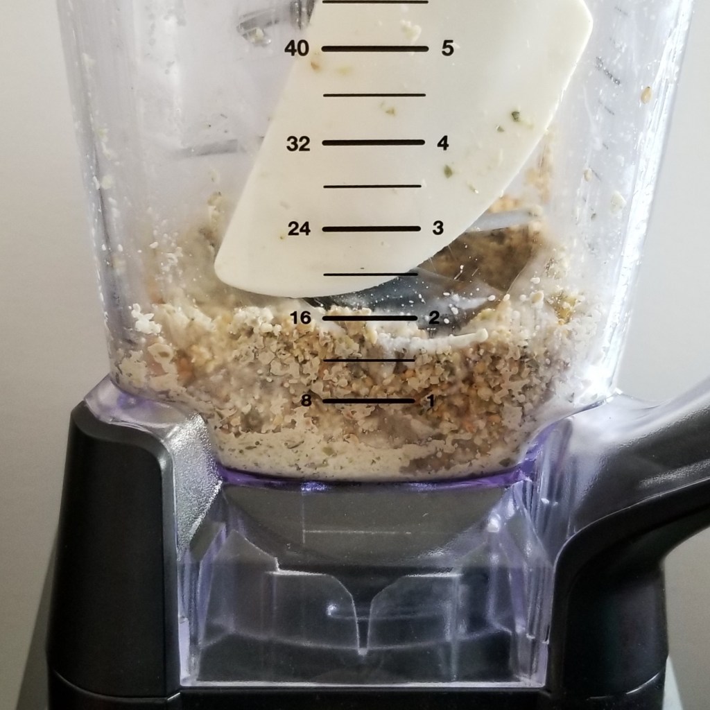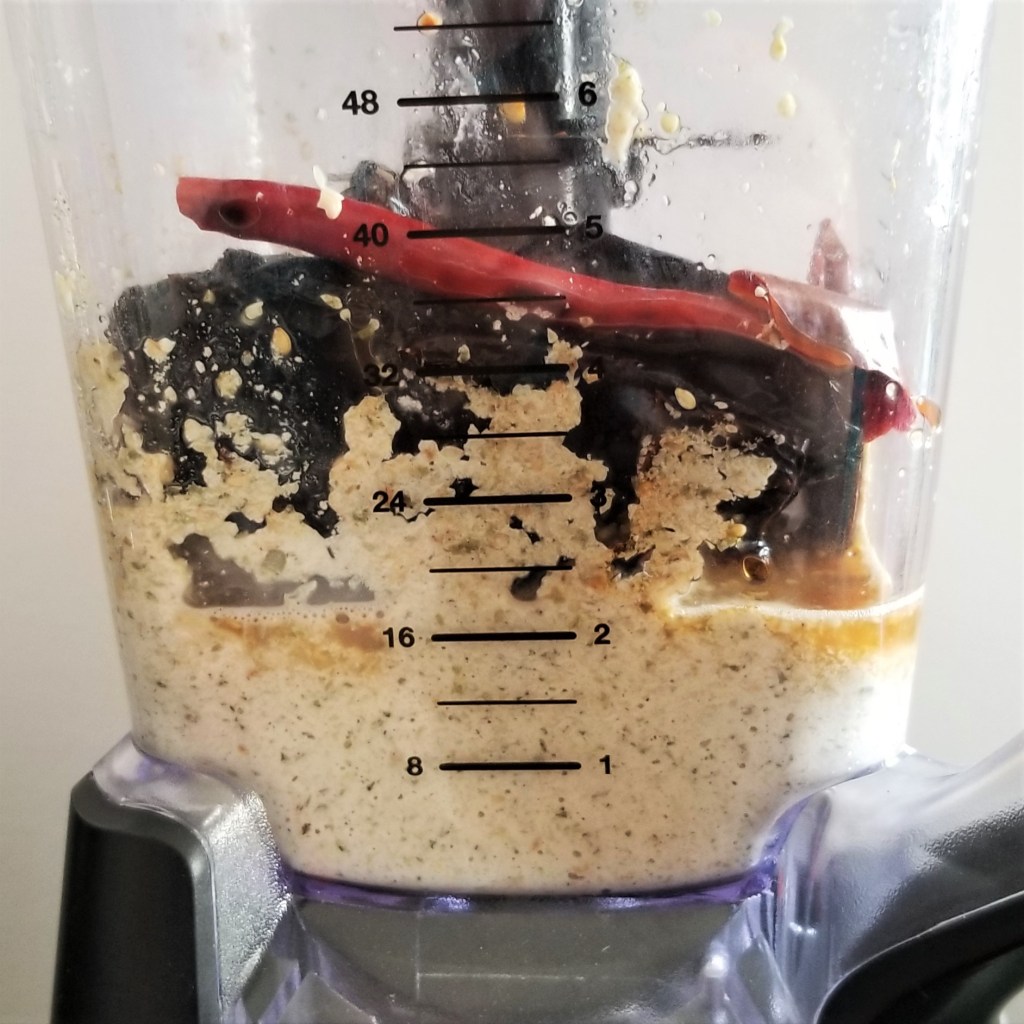 Process sauce: Place reserved seeds in a blender jar, and add half a cup of reserved broth (or water, for vegan, photo below, left). Process to grind all the seed, stopping to scrape with a spatula, as needed (photo below, centre). Add peppers and their soaking water to the jar (photo below, right):