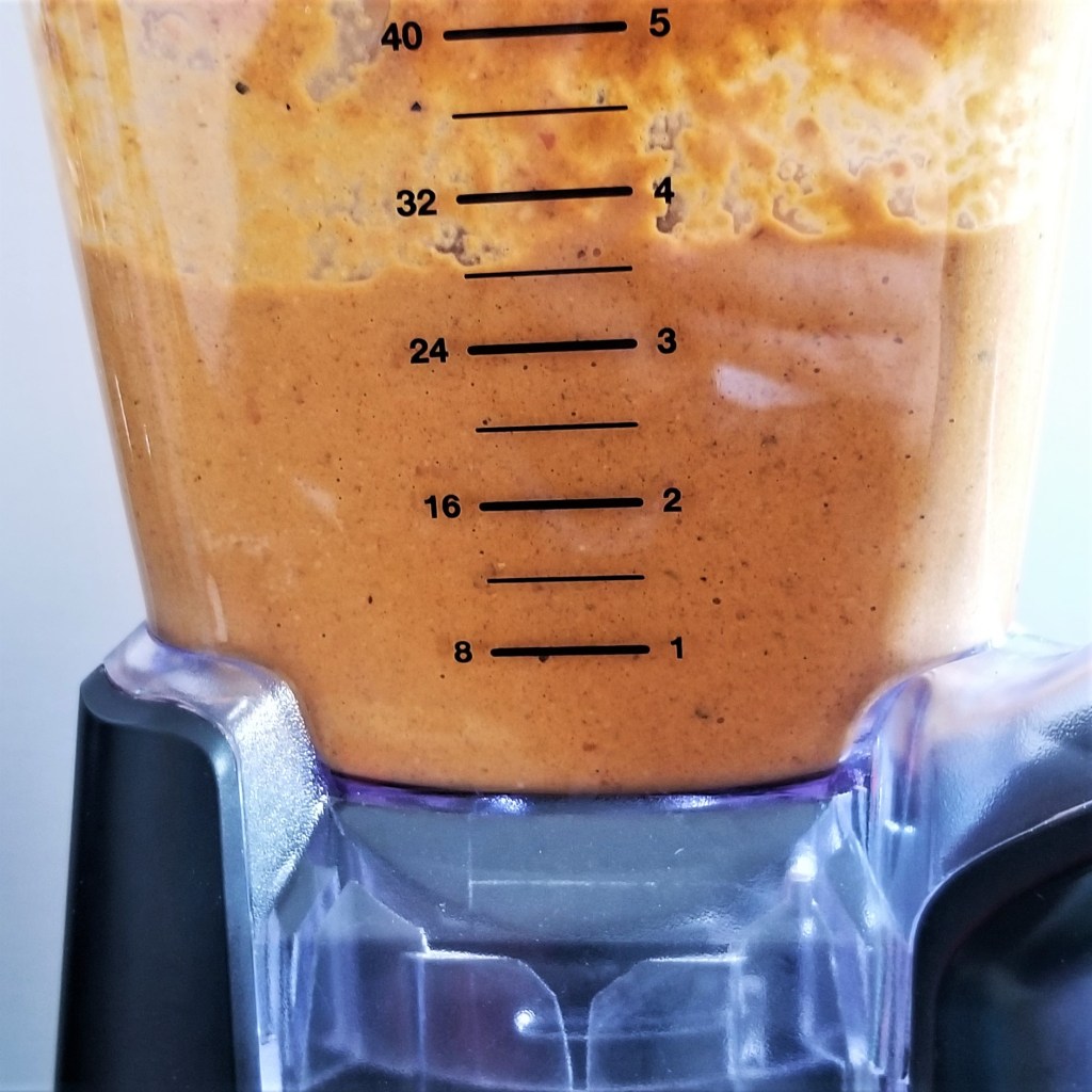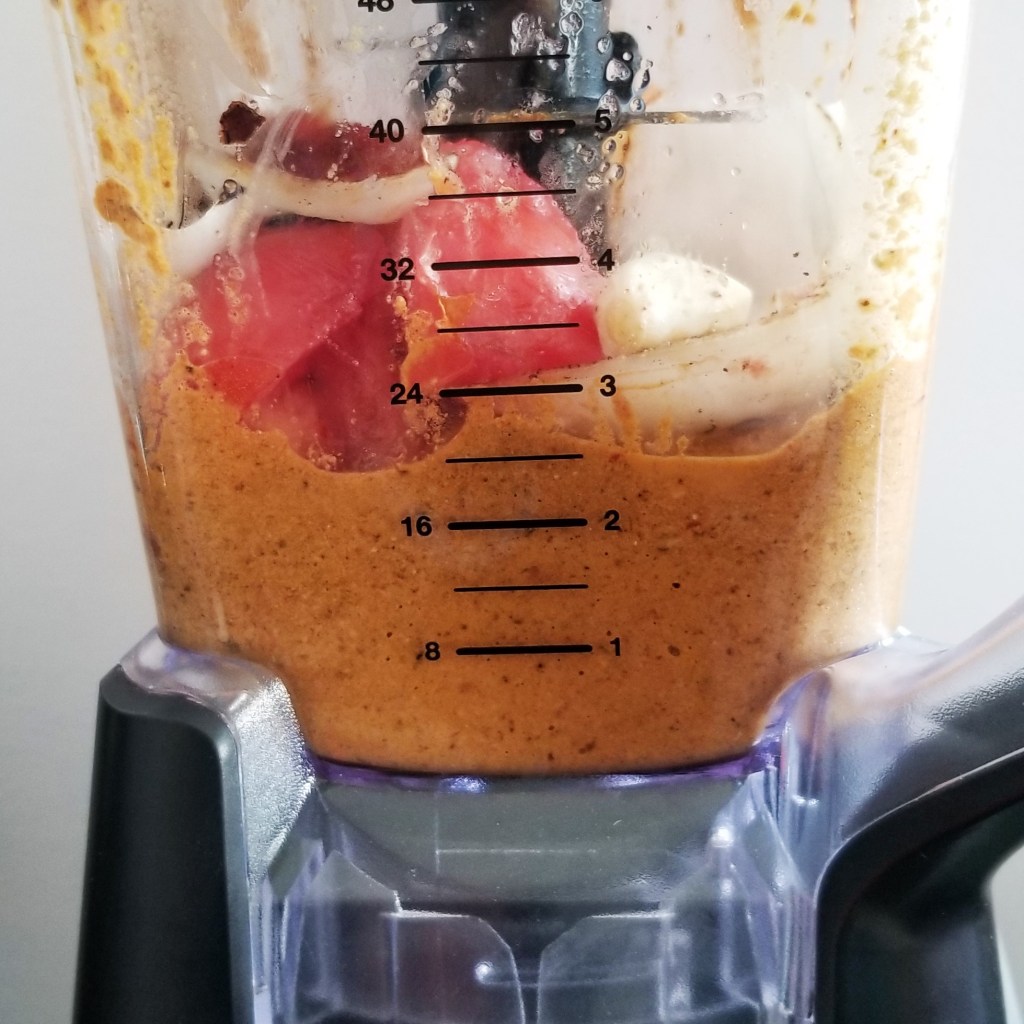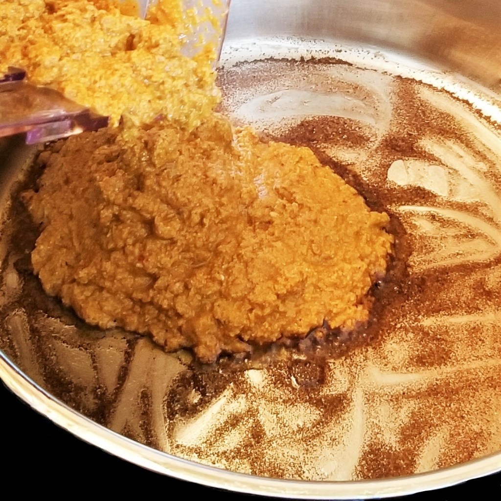 Cook sauce: In a large pot, warm up two tablespoons of oil over medium heat. Add reserved spices from small bowl (photo below, left). Stir to coat with the oil, allowing to become fragrant, about one minute, or less. Pour reserved sauce from the blender (photo below, right):