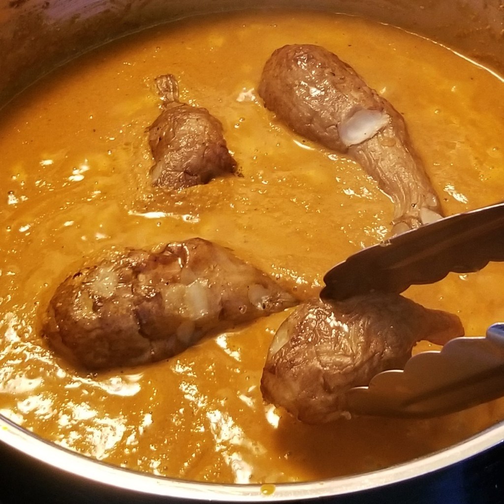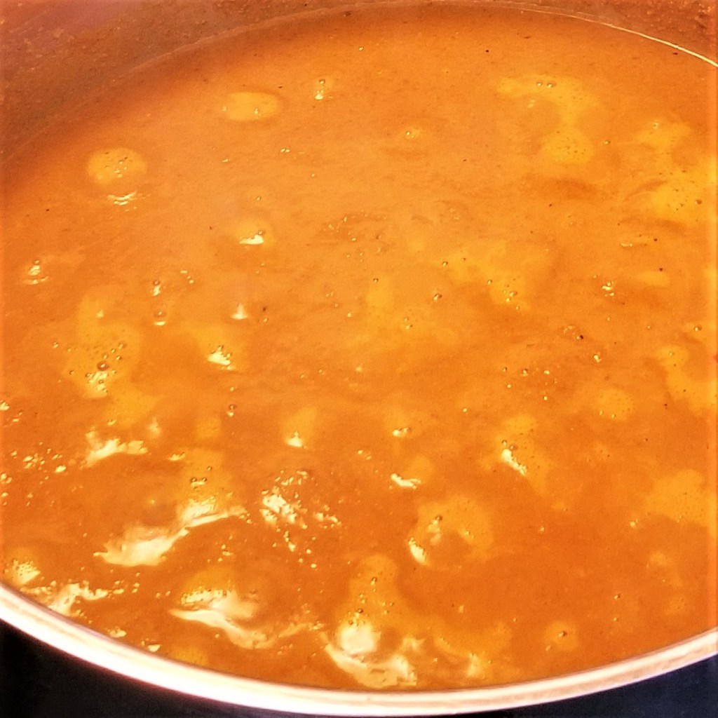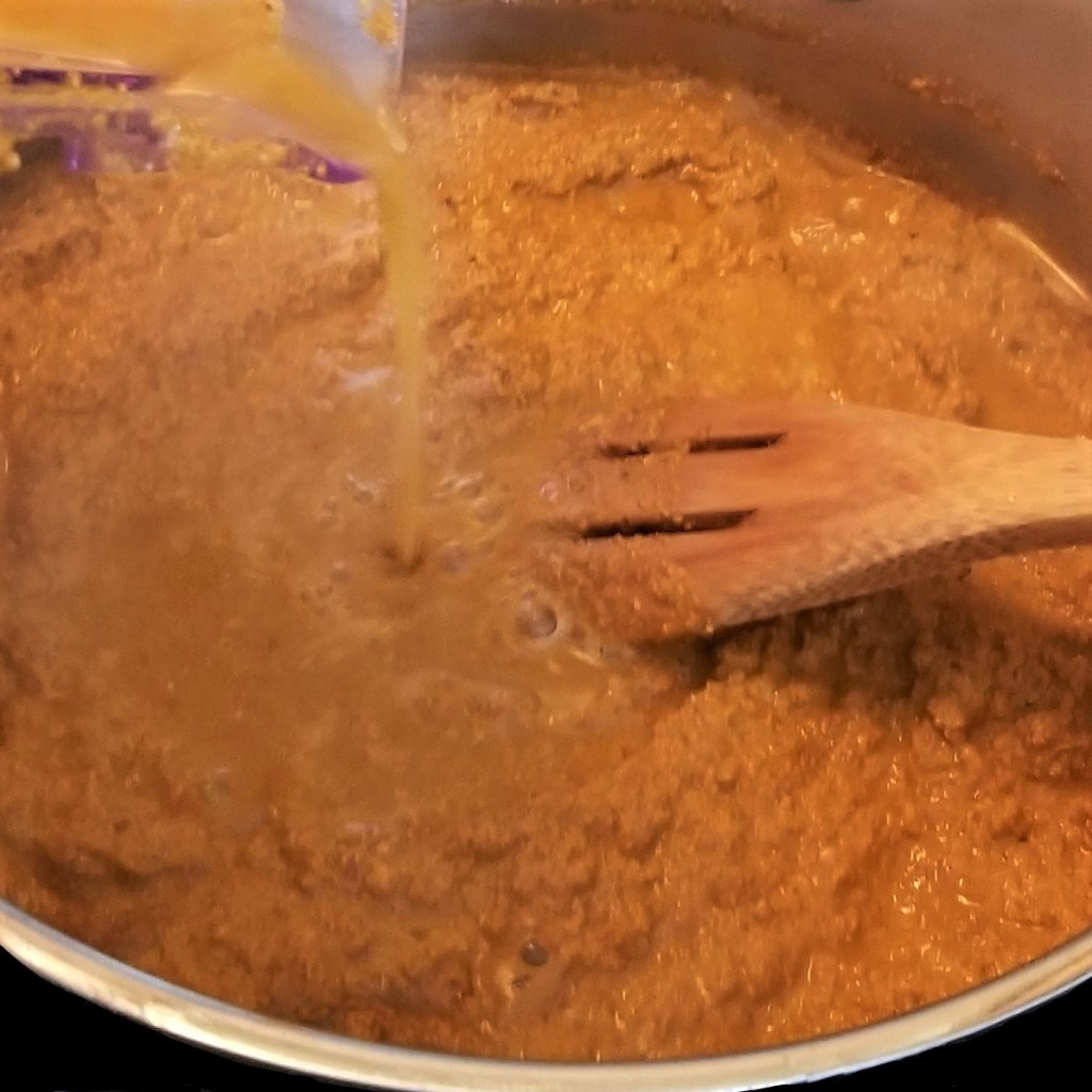 Cook sauce: In a large pot, warm up two tablespoons of oil over medium heat. Add reserved spices from small bowl (photo below, left). Stir to coat with the oil, allowing to become fragrant, about one minute, or less. Pour reserved sauce from the blender (photo below, right):