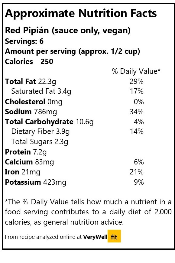 I have also posted about the origins and history of Mexican pipián, a dish given this name during colonial times, but known to be prepared before the arrival of the Spaniards to the American continent. It is based on native pumpkin seeds and peppers (chiles), although some recipes have become so elaborate, containing both Old and New World ingredients, that may be considered moles. Linguistically speaking, mole simply means “sauce”, from the Nahuatl molli, so technically, any Mexican sauce would be a mole (for example, guacamole – avocado sauce); by the way it is more commonly defined nowadays, though, usually mole refers to a complex sauce that has varied ingredients, including spices, fruits, seeds and different peppers (chiles). Pipianes may include all these ingredients, but the type that truly defines them as their own, is always the ground seeds. There are many pipián recipes, originating from individual family heirloom formulas, and depending on the region, mostly parts of the Mexican states of Tamaulipas, Puebla, Veracruz, San Luis Potosi, Queretaro and Hidalgo, as well as Mexico City. According to the ingredients, traditional or contemporary pipianes may be green, blushed, white or as in this case, red. This recipe was based on a recipe from Hidalgo, but may be considered as a “standard” contemporary recipe, which could be found in kitchens all around Mexico. The aspects I modified were the addition of sunchokes for a vegan option, and the techniques used regarding the spices, which are often roasted whole, ground in a molcajete (Mexican mortar), and then added to the sauce; I started with ground spices, which could easily burn and be hard to collect from a hot surface, so I added them later, directly to the final pan with oil, blooming right before incorporating the rest of the sauce, thus allowing all their aroma to pervade the sauce.