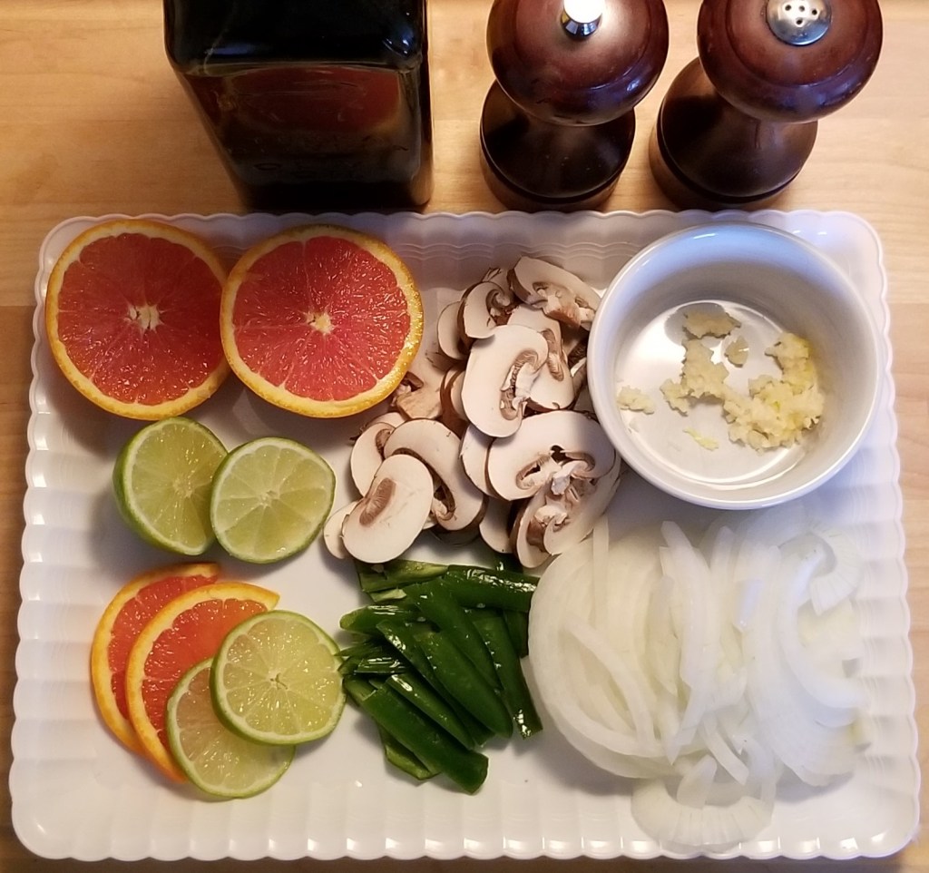 First, prepare all ingredients for the sauce and toppings: Slice one lime and one orange in half, then some slices from each, for garnish. Remove stem(s) and seeds from pepper(s) and slice into strips. Wipe mushrooms to remove dirt, and slice. Place minced garlic in a bowl. Slice onion in half, then into thin slices: