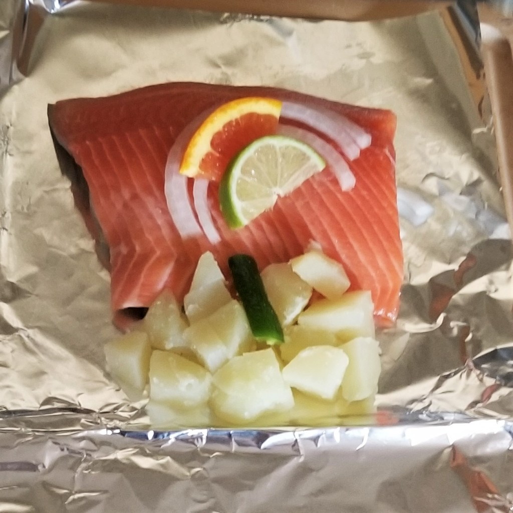 Brush the centre of the square on the working surface with a little oil. Reserve some of the sliced onions and peppers for garnishing, then place one quarter of the rest on the greased spot on the foil, along with a quarter of the sliced mushrooms (photo below, left); pour one teaspoon of sauce over the veggies. Place one piece of fish on top of the veggies, skin side down (optional: for tail-end pieces, tuck the narrow tip in, for a more uniform thickness); garnish top with some reserved onions, and one or two pieces of orange and lime slices. Place one quarter of the potatoes and a piece of reserved pepper next to the fish, near the fold (photo below, right):