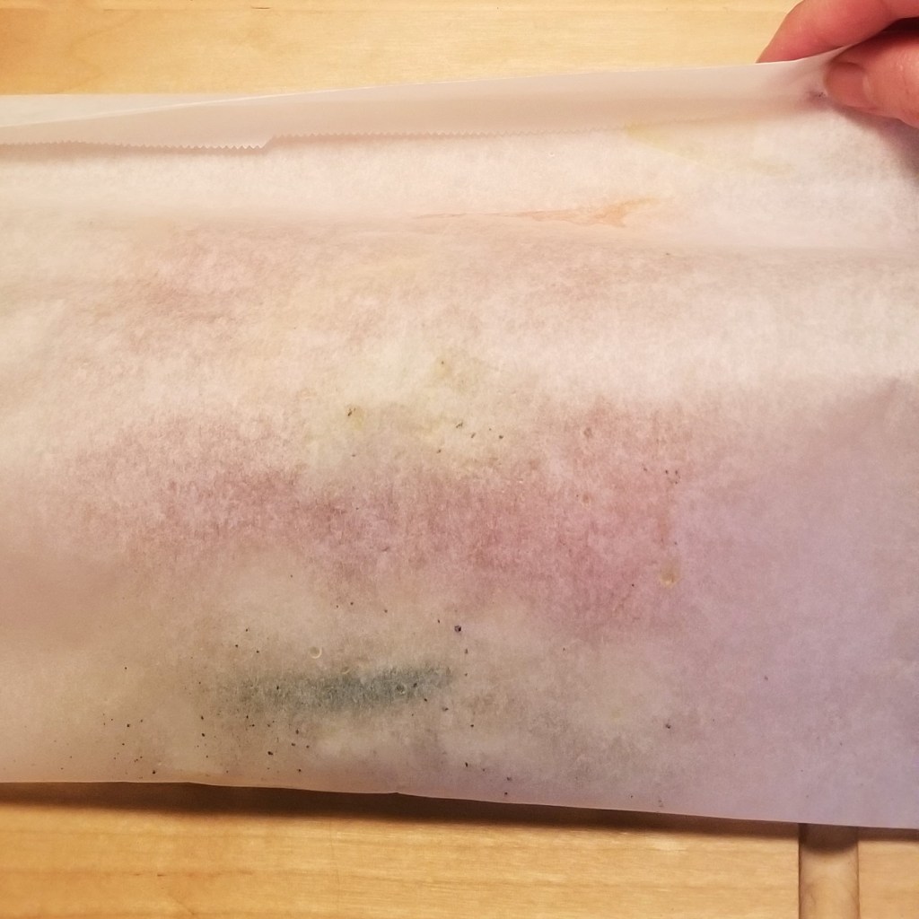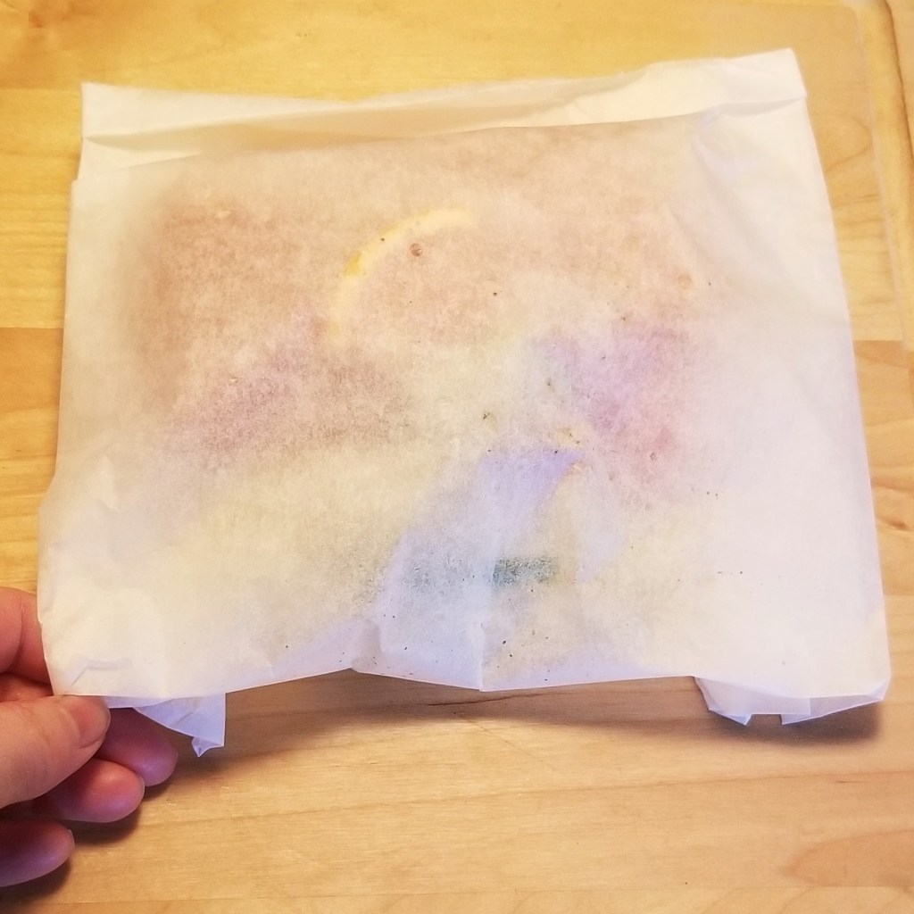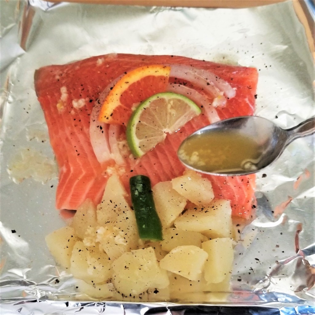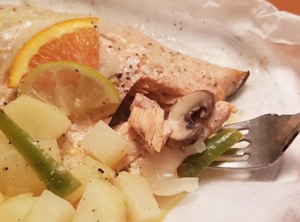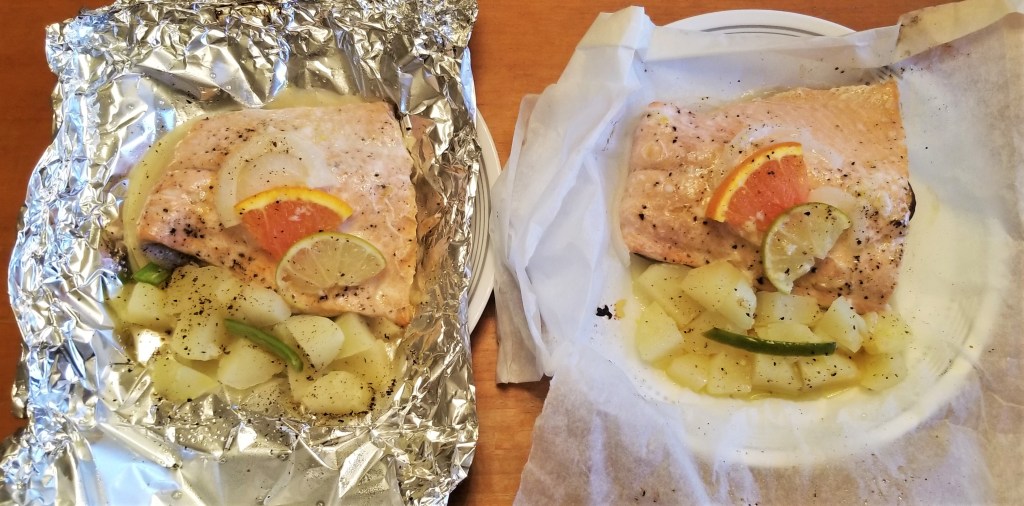 My husband and I shared the two packets, to compare side to side. The flesh was equally moist, and flaky, but still firm and with the characteristic nice and “meaty” texture of properly cooked trout. The skin was not crispy, but had a pleasant bite and great flavour. The potatoes and veggies were equally delicious for both. As for differences, the fish from the paper packet looked slightly browned, and the sauce seemed thicker; this is what determined the final judgement to favour the paper packet, because that extra layer of flavour from the browning took the fish to a different level, and the thicker sauce made for a better melding of the delicious citrus juices with the oil and garlic. I thought of sort of an equivalent of pressure vs slow cooking, with the foil packet probably having a tighter seal, as in a pressure cooker, while some steam may escape from the paper packet, as in a slow cooker, reducing the water content, and hence allowing some browning of the fish, and thickening of the sauce: