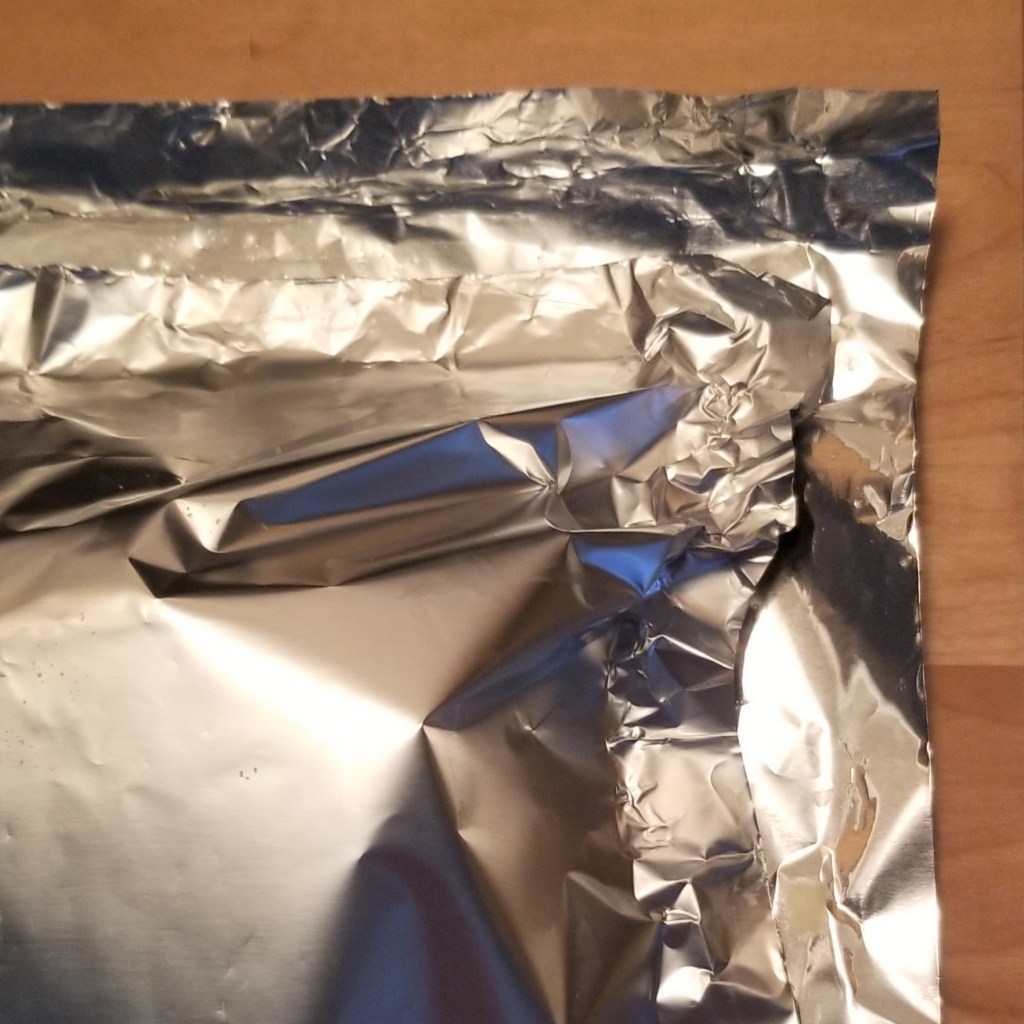 Fold foil over, to cover the food, leaving about half an inch (1.25 cm) of space from the edges of the bottom square of foil (photo below, left). Fold edges over the top square of foil, closing the packet (photo below, right):