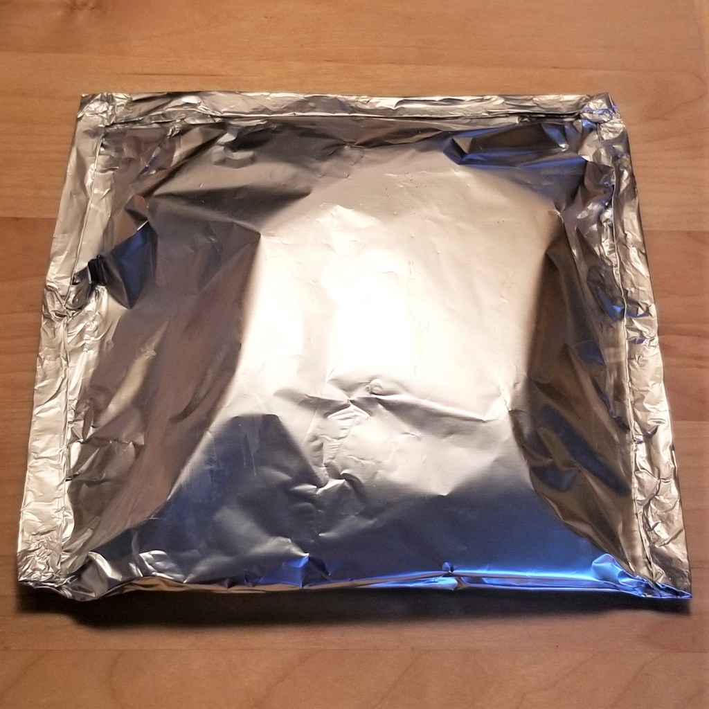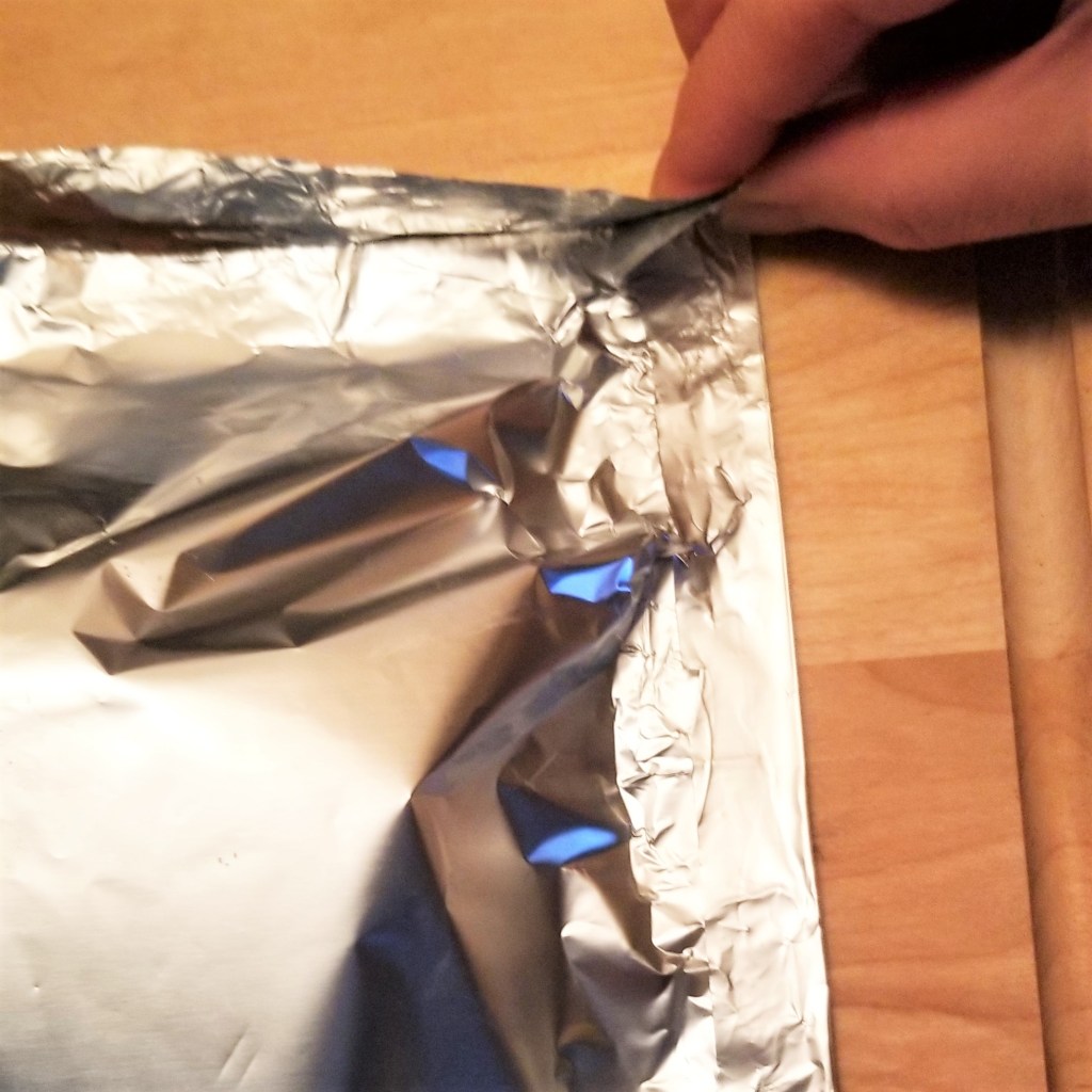 I started with a piece of foil. Fold one rectangle in half, shiny side in, so it forms a square. Open like a book, with the fold parallel to the edge of the working surface: