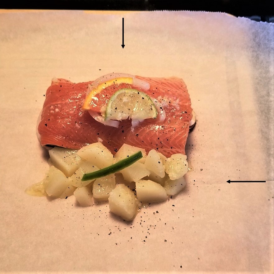 For the parchment paper wraps, fold square twice to form a four-layer square, then unfold and place on working surface. The food will be placed at the centre of the top half of the paper (in the photo below, see arrows marking the folds). Brush with a little oil, and proceed to assemble the fish and potatoes as with the foil: