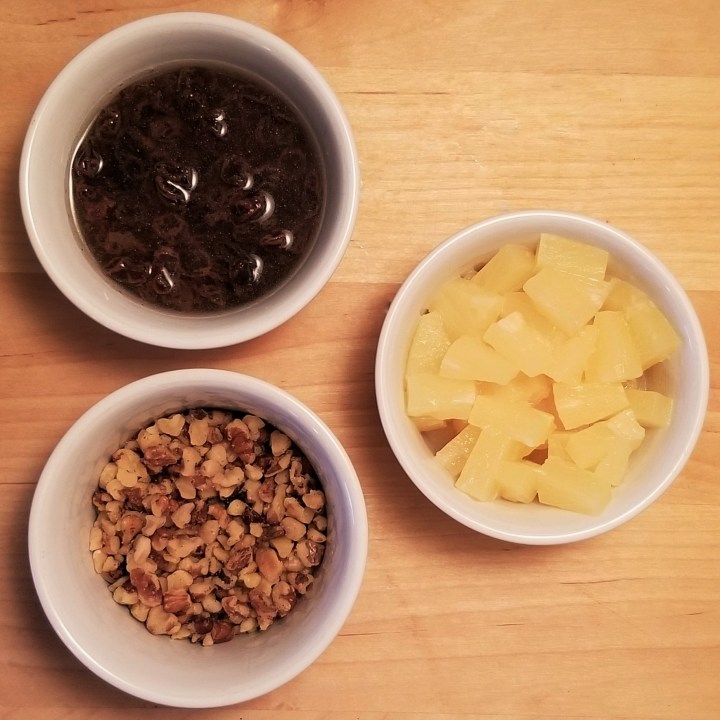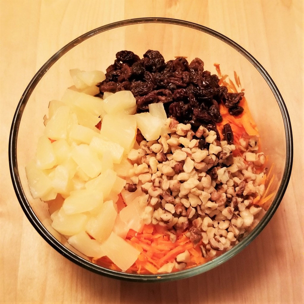 Shred carrots with a cheese grater or in the food processor; place in a mixing bowl and reserve. In a small bowl, soak raisins in the boiling water; slice pineapple into chunks, and reserve; chop walnuts, and reserve: