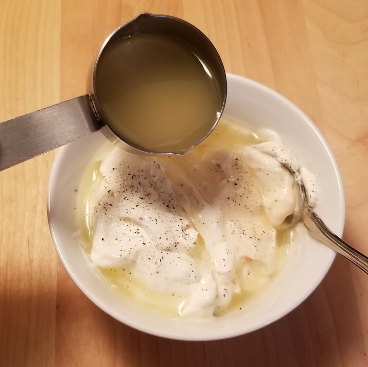 In another bowl, mix together the mayonnaise, cream, and sugar; add salt, pepper and pineapple juice: