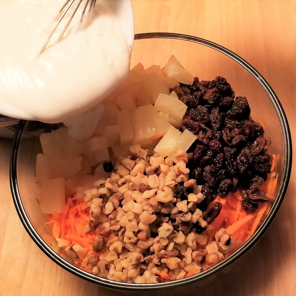 After a few minutes, drain and discard water from raisins, then add re-hydrated raisins to the bowl with the carrots, along with the reserved pineapple chunks and chopped walnuts (photo below, left). Pour dressing into the bowl (photo below, right):
