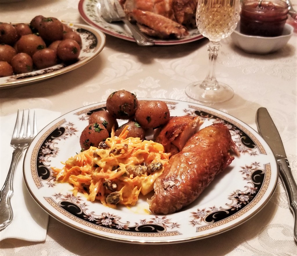 Currently living in Canada, we usually go to Toronto and spend Easter with my in-laws, who are originally from Cyprus, so we would have a Greek-style Easter Sunday lunch of roasted lamb, lemony potatoes, braided sweet bread and red-coloured hard boiled eggs. Hence, I usually do not have to worry about cooking a meal for Easter Sunday, but because of COVID19, this is the second year in a row that we will stay home; I have chosen lamb, or roasted turkey, but without the stuffing, serving instead with garlicky baby potatoes and this sweet carrot salad: