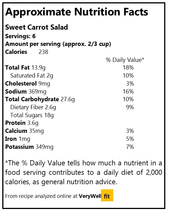 This classic salad seemed ubiquitous at social gatherings in the 1970s and 80s, at least in Mexico; many showers, potlucks and birthday parties would include some version of sweet carrot salad, to serve along with pork roast, chicken or devilled eggs.