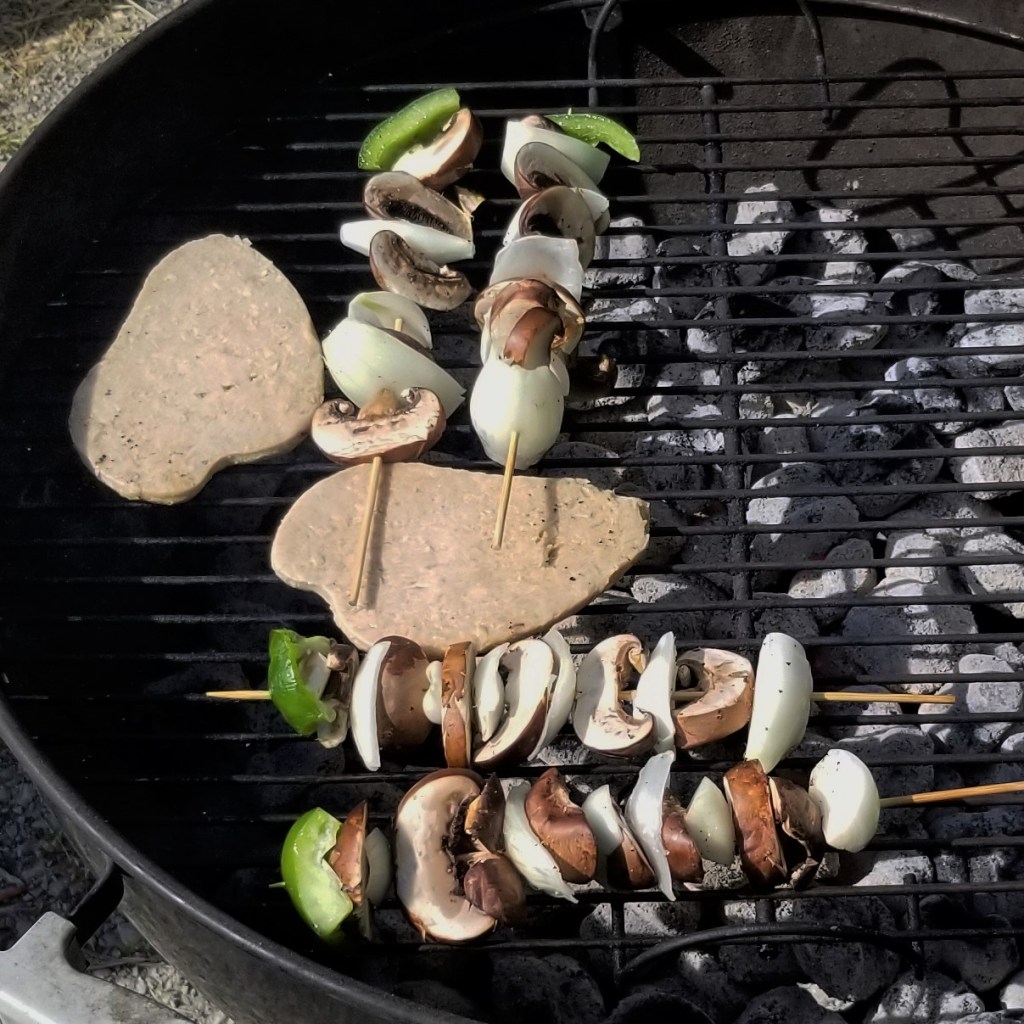 For a vegetarian option, prepare basic skewers with veggies, and supplement, for example, with meatless chicken cutlets: