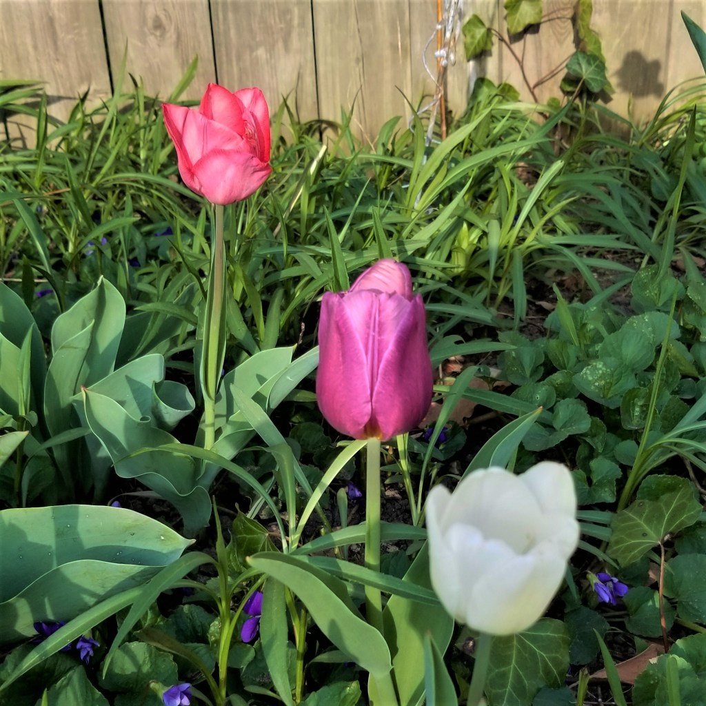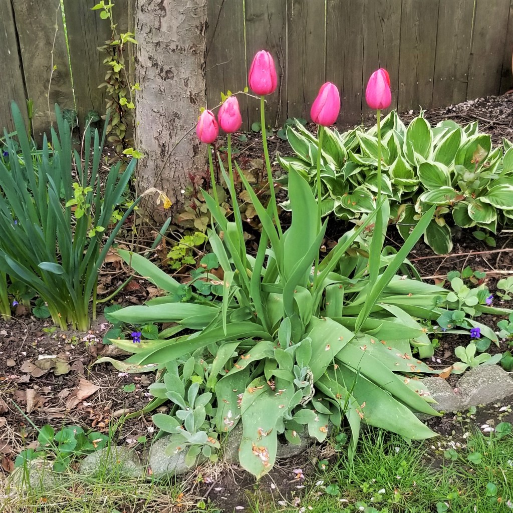 The photo below is from yesterday, and features pink tulips, usually the last batch to bloom in my backyard: