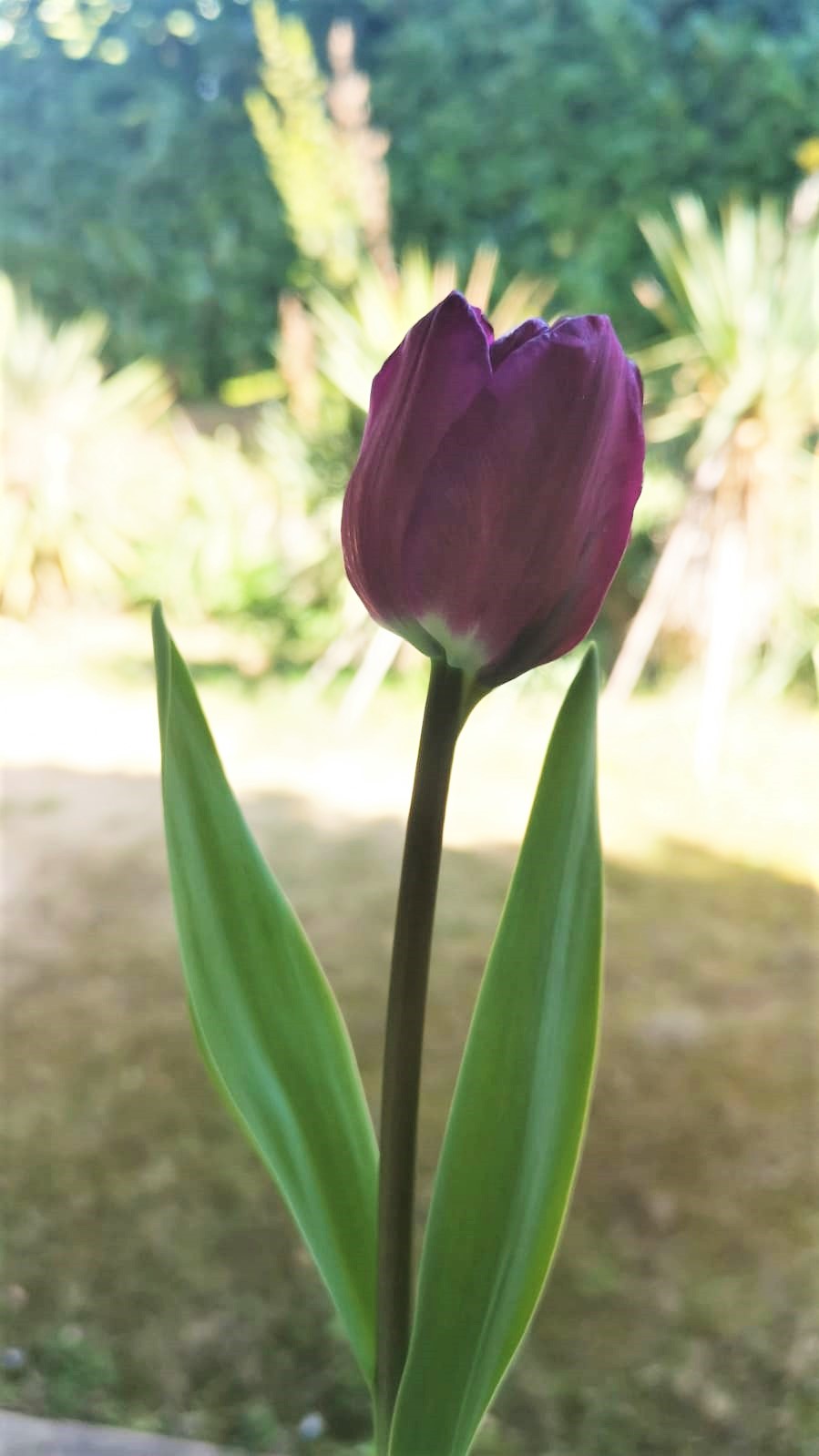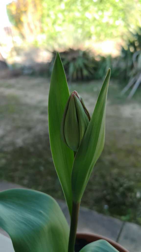 One of my daughters is in France for a year; she got a potted tulip bulb for her birthday last fall. She kept the pot indoors until spring, and shared the photo below when it started to bud: