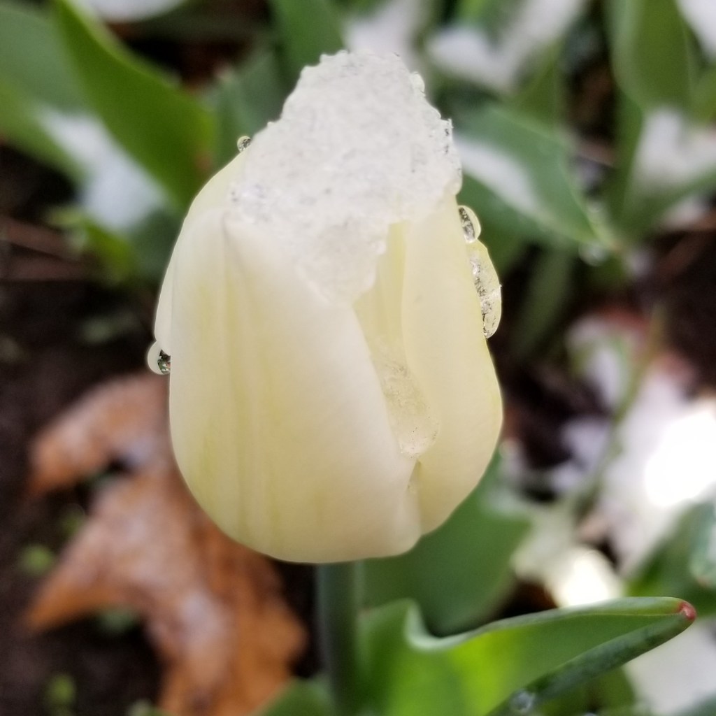 Warm weather in March made the tulips bloom earlier than average this year, only to be covered with snow a month later: