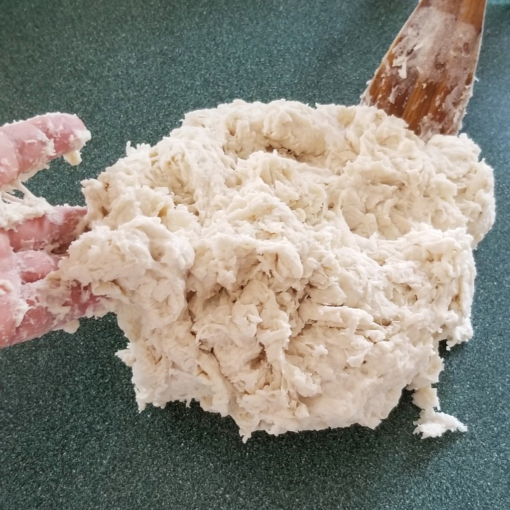 The mix should be very moist and brittle.  At this point, do not sprinkle flour on the working surface, or dough, which will be sticking to hands and working surface; work by gently kneading with one hand, and gathering dough and folding with a spatula (see *NOTE at the end).  The photo below, left, shows the progress after two minutes of kneading and folding.  Continue for about 8 minutes, noticing how the dough starts to feel more elastic, and may be gathered off the working surface (photo below, right, after four minutes):