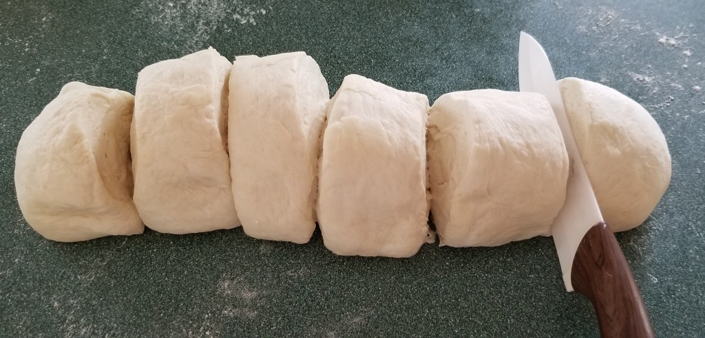 * NOTE:  I used to torture my yeast doughs while kneading, by pounding and pushing them against the working surface, but recently, I started watching “Bake with Jack” on YouTube; he explains that this is not only unnecessary, but might actually end up damaging the structure of the dough, and even prolong the required kneading time.  He actually has a video in real time (a lot of fun to watch and learn the proper technique), showing how in approximately 8 minutes, a batch of basic white bread dough is ready.  He also recommends not adding any flour at all to the dough or the working surface until after the kneading is done, at which time he allows the dough to rest for 3 minutes; adding a sprinkle of flour before forming the round shape for rising is fine at this point.  I followed his method, and I was amazed at how well it worked for me, as it may be seen in this recipe.