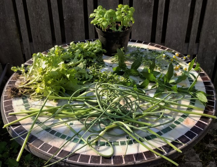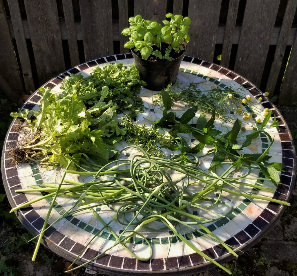 This year, there were no berries for me, although the squirrels have partaken in the feast of some early fruit already.  My harvest was all greens, mostly herbs, clockwise from the pot at the top, which has some basil ready to eat, and a few smaller seedlings; some chamomile and spearmint; the whole crop of garlic scapes, collected to allow the garlic bulbs to grow strong; all my loose-leaf lettuce and cilantro, before they bolted with the heat; and in the centre, a little oregano, although the plant is really big and will need heavy trimming soon: