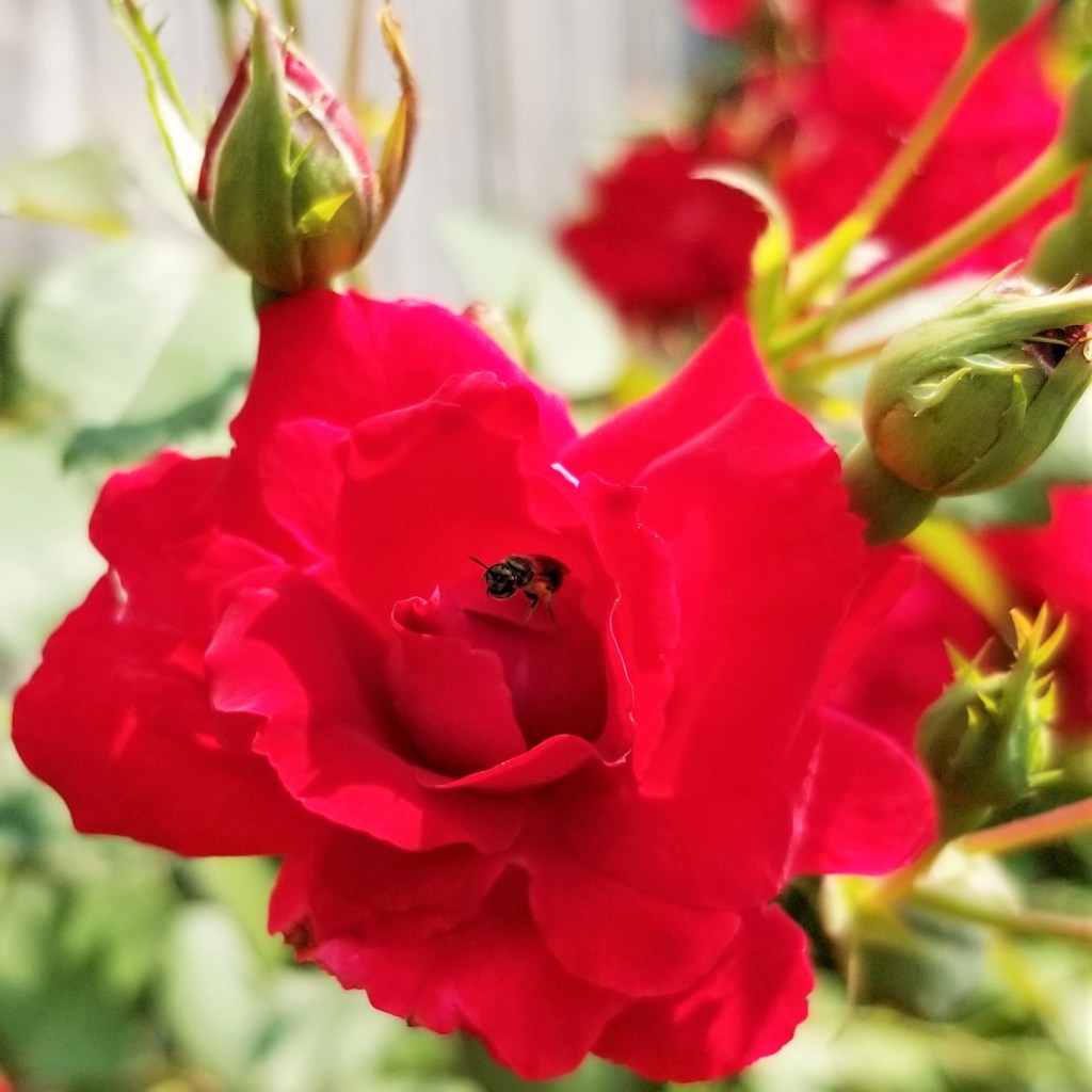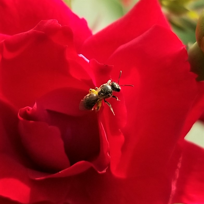 In the photo below, left, it was hard to see all the features in the little guy coming from inside a red rose. It looked chunky, so I guessed it was not a wasp; its tiny size and hardly visible antennae were inveigling towards granting a fly ID, but its true nature became clear after looking at a close-up once it was out of the flower (photo below, right):