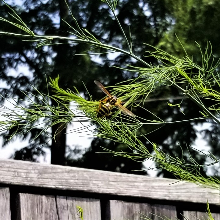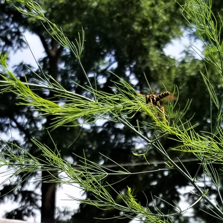 The next subject was much larger, seen in the photos below flying around some asparagus fronds. On the left, the side view shows a slender bug with long hind legs, pointing to a wasp. The photo on the right, showing a view from the top, confirms that it was a wasp from the very narrow waist: