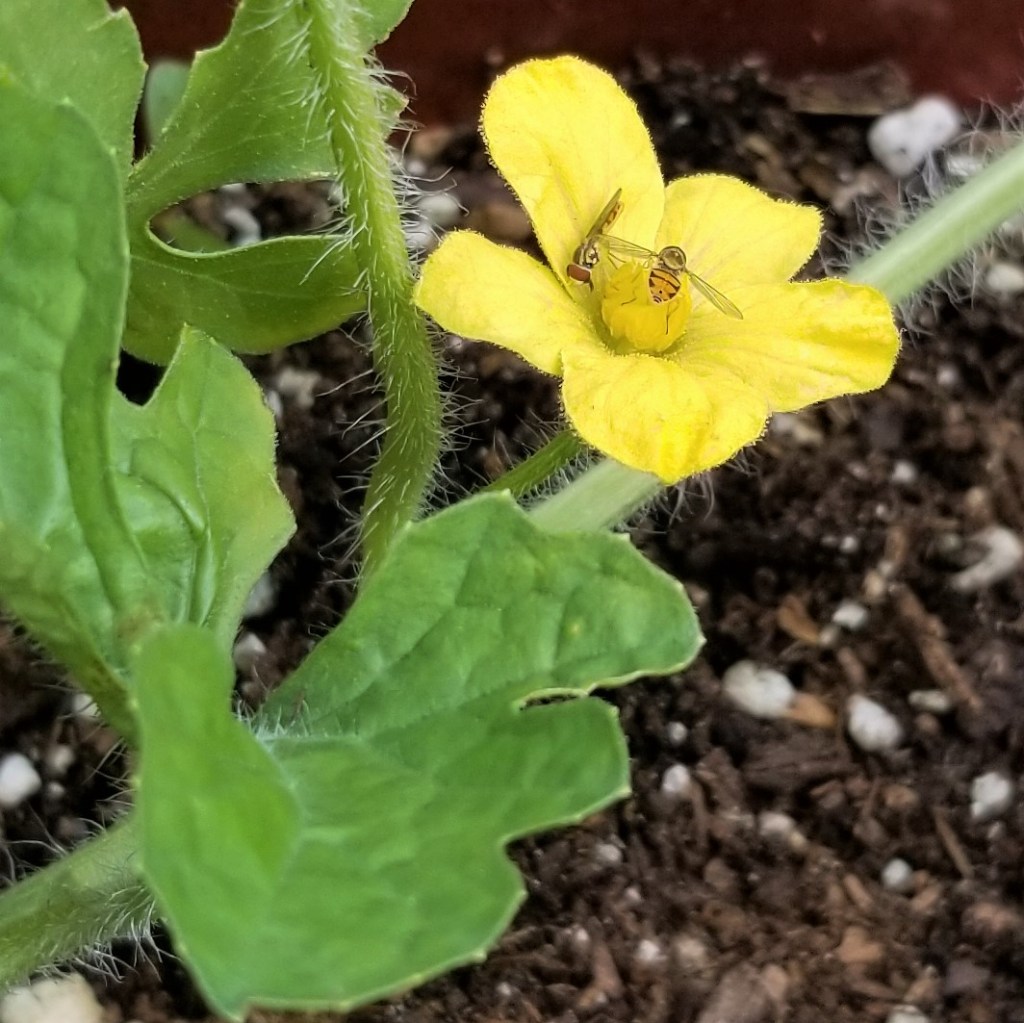 As the good pollinators that they are, I am sure they have also visited some female watermelon flowers (with the bulgy bottom), like the one shown below, left, since my vines are already growing some fruit (photo below, right):