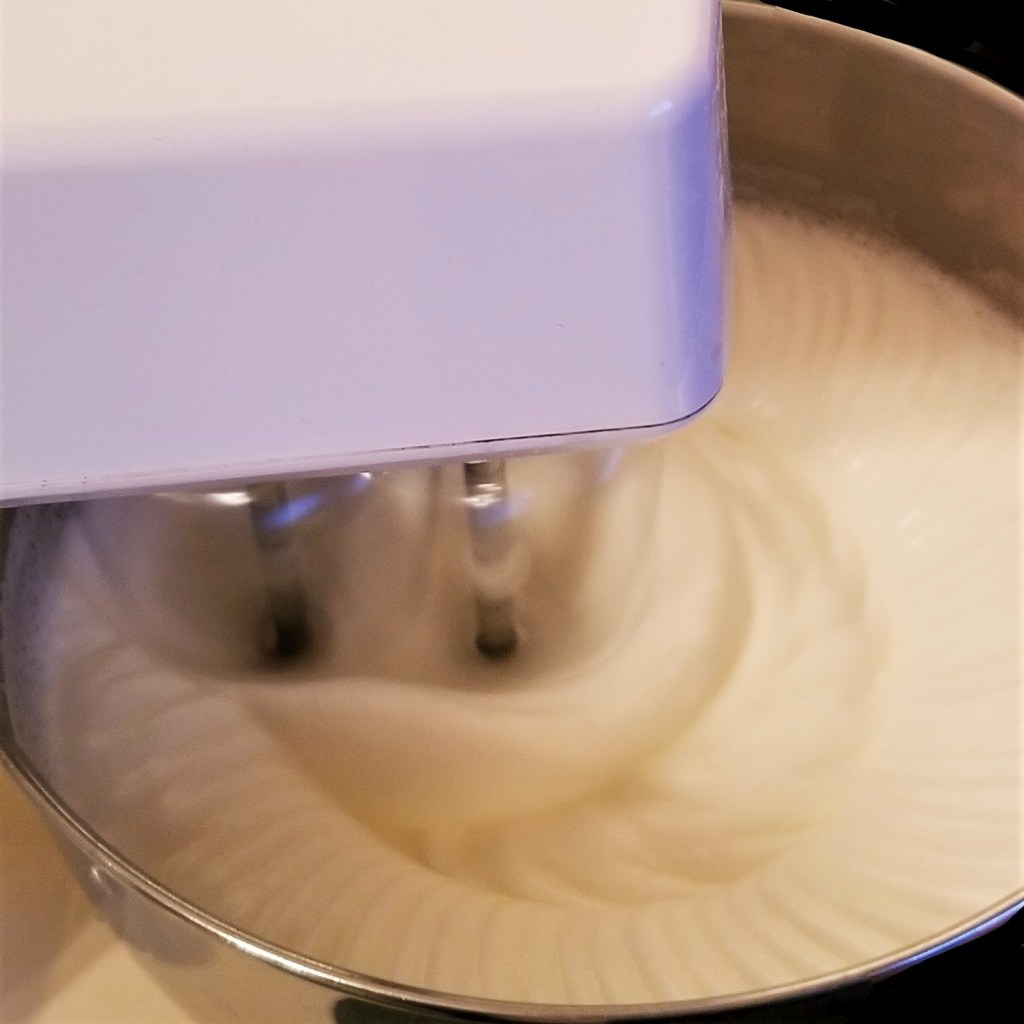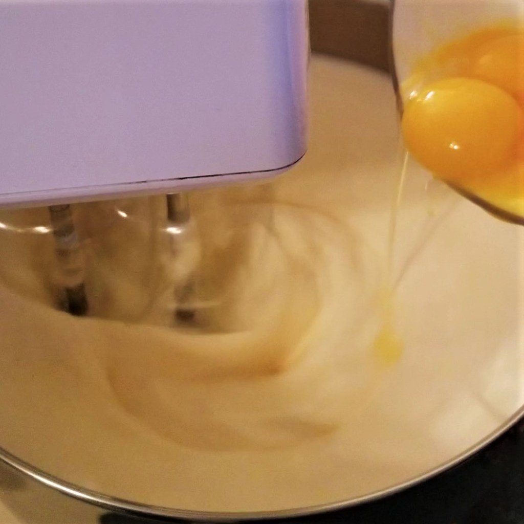 Place the egg whites in a perfectly clean and dry mixing bowl, and beat until they turn white and form peaks (photo below, left). Continue beating vigorously while adding the egg yolks, one at a time (photo below, right):