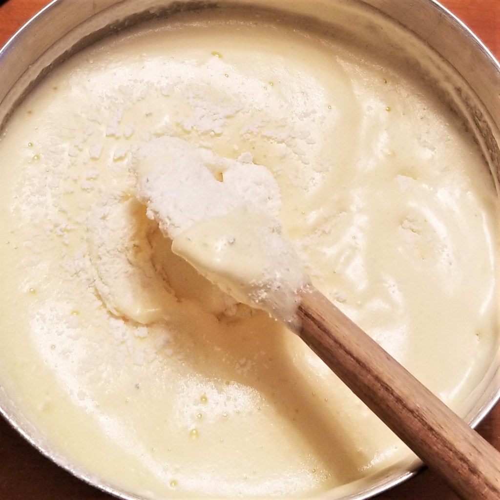 Continue beating until ribbons of the egg mix traced on the surface remain for a while (photo below, left). Sift sugar, corn starch and baking powder through a fine mesh, onto the egg batter, and fold gently to incorporate (photo below, right):