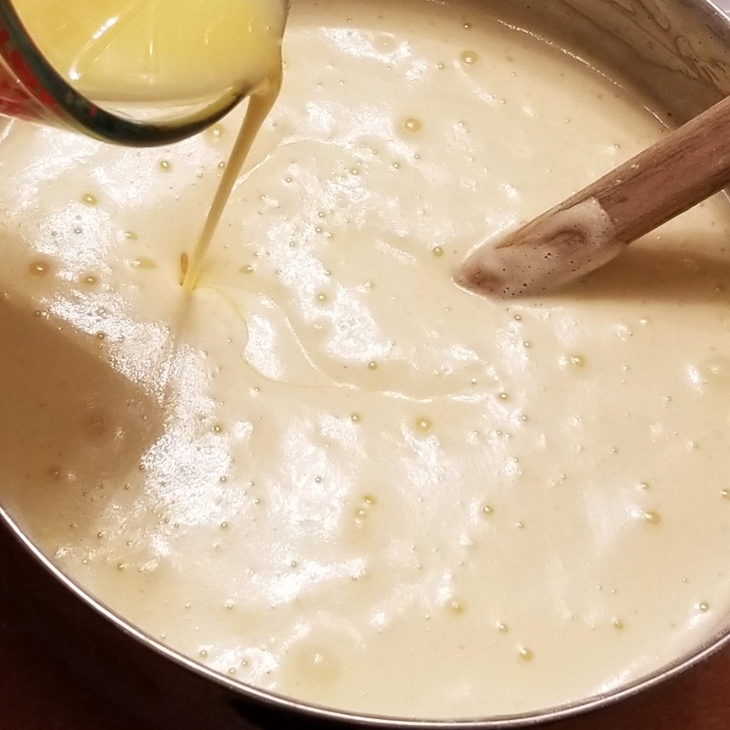 Finally, pour in melted and cooled-down butter, mixing gently, but thoroughly, until uniform and smooth (photo below, left). Divide batter between the lined 8x8inch pans, or pour into one 9x13inch pan (photo below, right):