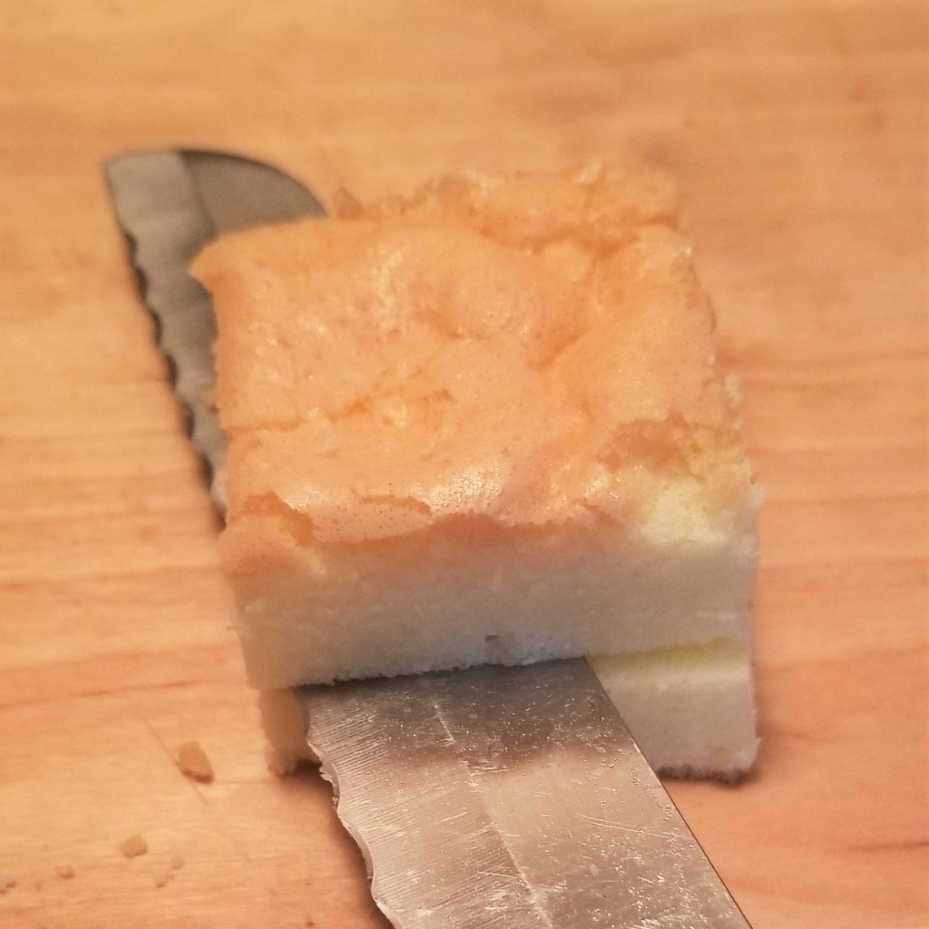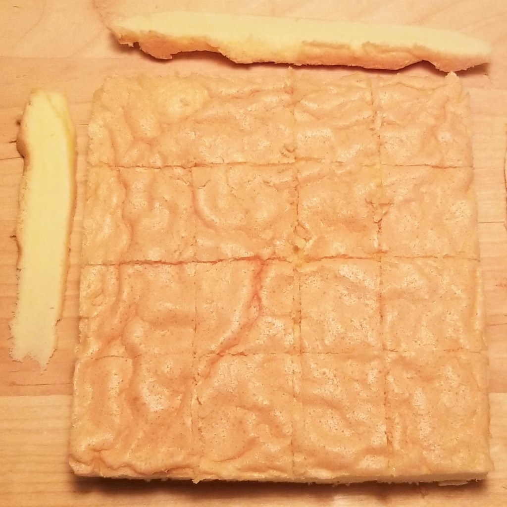 Bake in pre-heated oven for approximately thirty minutes, until golden brown and a toothpick comes out clean after inserting at the centre of the cake(s). Remove from oven, and allow to cool down in the mould (cake will be very brittle); as it cools, the cake will shrink a little, forming a pattern on the top, as seen below, left. Take the cake(s) with parchment paper out of the mould, then gently pull the paper away from the cake and remove. Trim the edges of the cake with a serrated knife. I further sliced one of marquesotes into a grid with sixteen portions (photo below, right):
