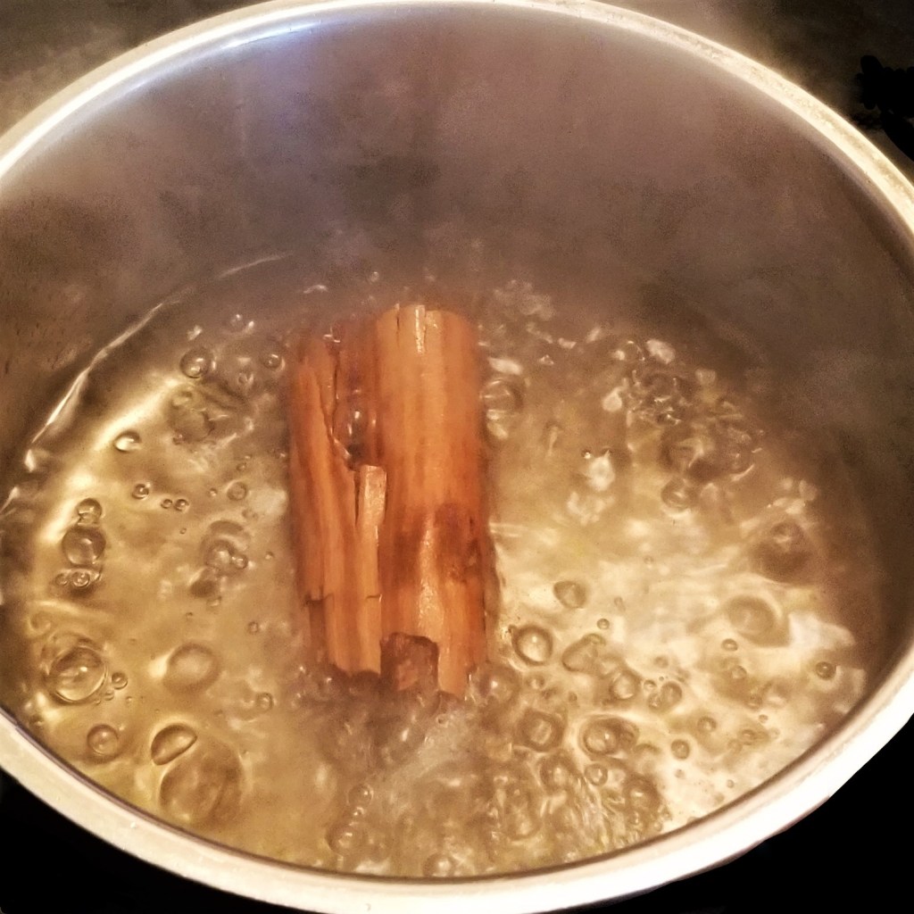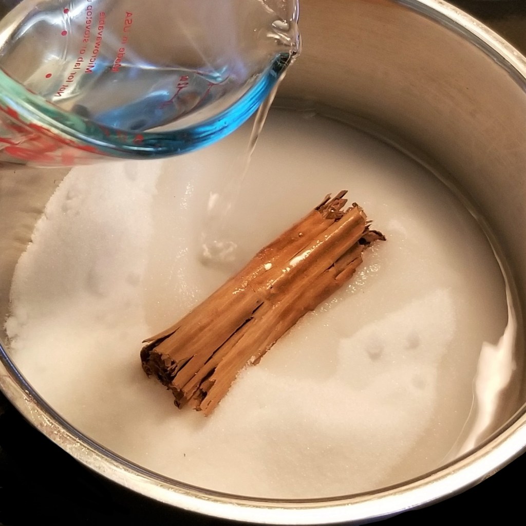 Remove from heat, and allow to cool down. It should remain clear, but might have a slightly yellow coloration from the cinnamon. Once cooled down, remove and discard cinnamon stick.