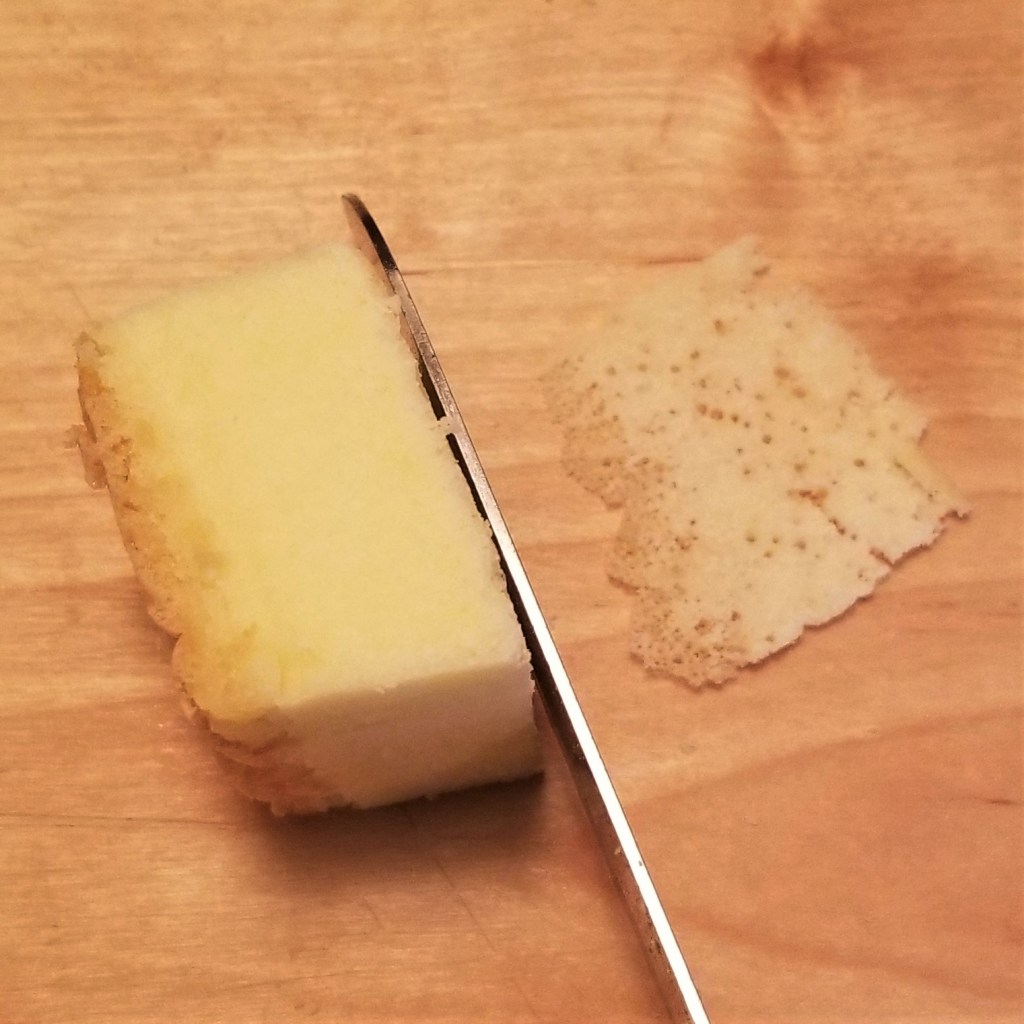 For mamón, slice off a thin layer from the bottom of the cake (photo below, left). For ante, slice in half horizontally, to form two layers (photo below, right):