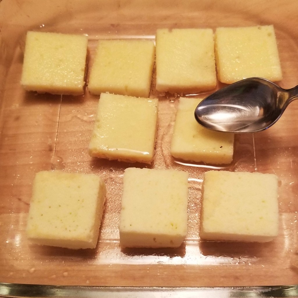 Place cake slices, cut sides facing up, in a dish with rim. I had three pieces for mamón, and six halves for ante. Pour syrup generously over each cut surface: