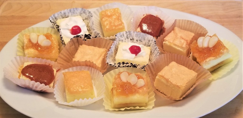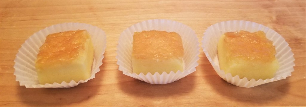 For this recipe, I am using corn starch, and including butter, but skipping the sesame seed. I could not make up my mind about what flavourings to add, so I decided to slice one marquesote into individual portions, leaving a few plain, to appreciate the original flavour (in brown paper cups, in the photo at the top of the post), plus a few with syrup (mamones, in white cups), others with apricot preserves (ante de chabacano, in yellow cups), and also made some with cajeta (goat’s milk caramel, in pink cups) and soaked in tres leches (three milks: cream, evaporated and condensed milk, in patterned cups).
