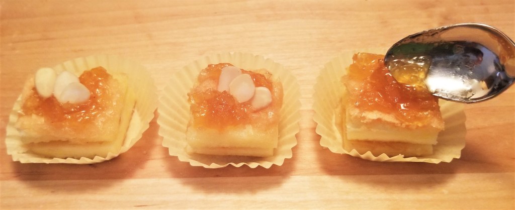 For the ante pieces, I placed the bottom halves, cut side up, in yellow paper cups, then topped each with apricot jam. The top halves are placed on top, cut side down, and more jam is added on top. Finish with a few almond slivers, as decorations: