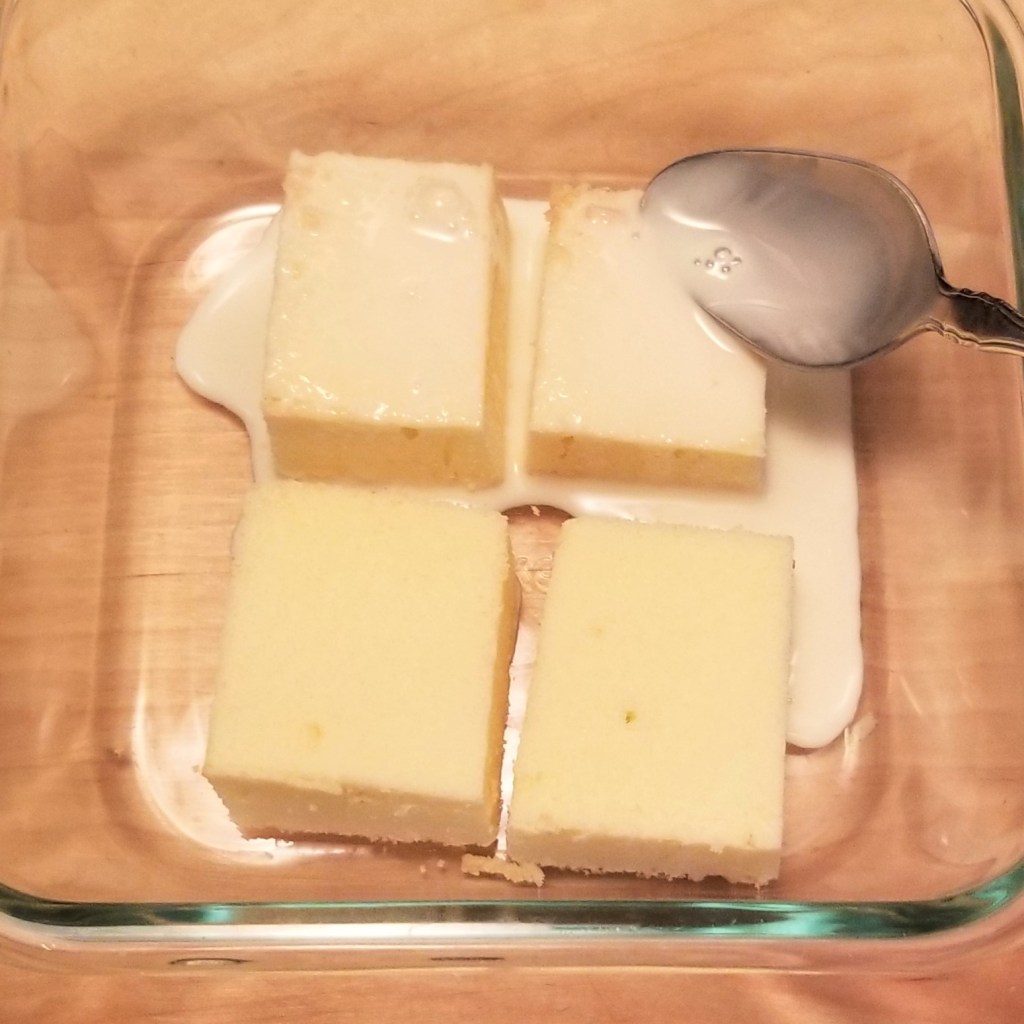 Finally, for the tres leches flavour, slice the crispy top of the cake off (I used the last four pieces). Place in a dish with rim, and pour the mix of the three milks over:
