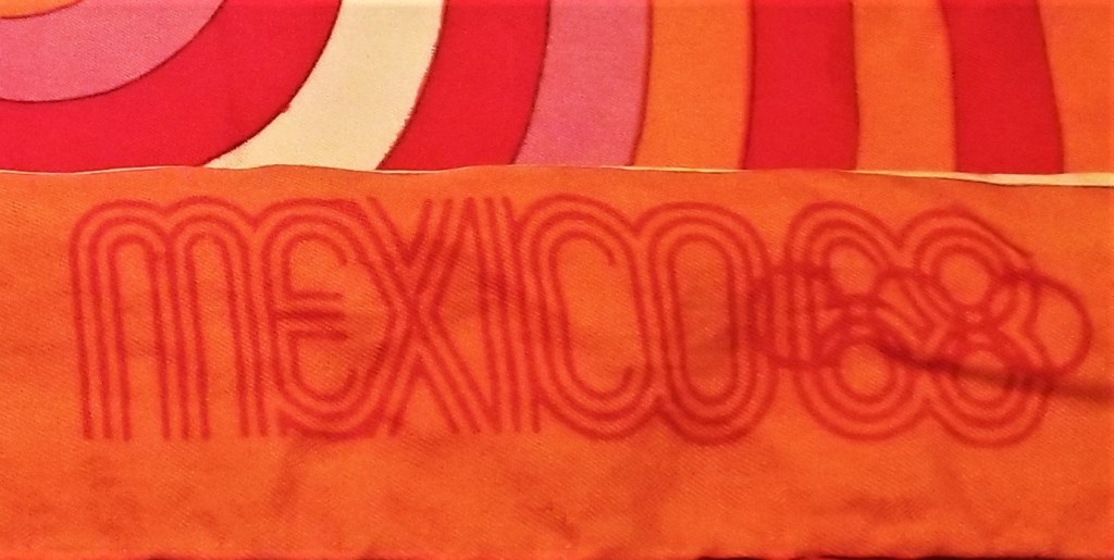 I remember the games in Mexico City, four years later. At the time, I was a very young girl, and did not comprehend what had happened just a few days before the opening ceremonies, on that fateful October 2, 1968, when there was a horrid massacre at a student protest in Tlatelolco. As a grownup now, it blows my mind that the games were inaugurated ten days later, and went on from October 12th to the 27th. Because of Mexico City’s high altitude (2,240 meters, or 7,350 ft) performances and records were somewhat affected, especially for track and field events. I remember watching the games on TV, and one of my aunts took us all kids to some of the venues that offered free admission during training sessions. We had all sorts of memorabilia from the games: stickers, pictures, calendars, etc., but the only one I have left is a scarf featuring the Olympic rings, shown as background at the top of this post, and the Mexico ’68 logo around the rim, as shown below: