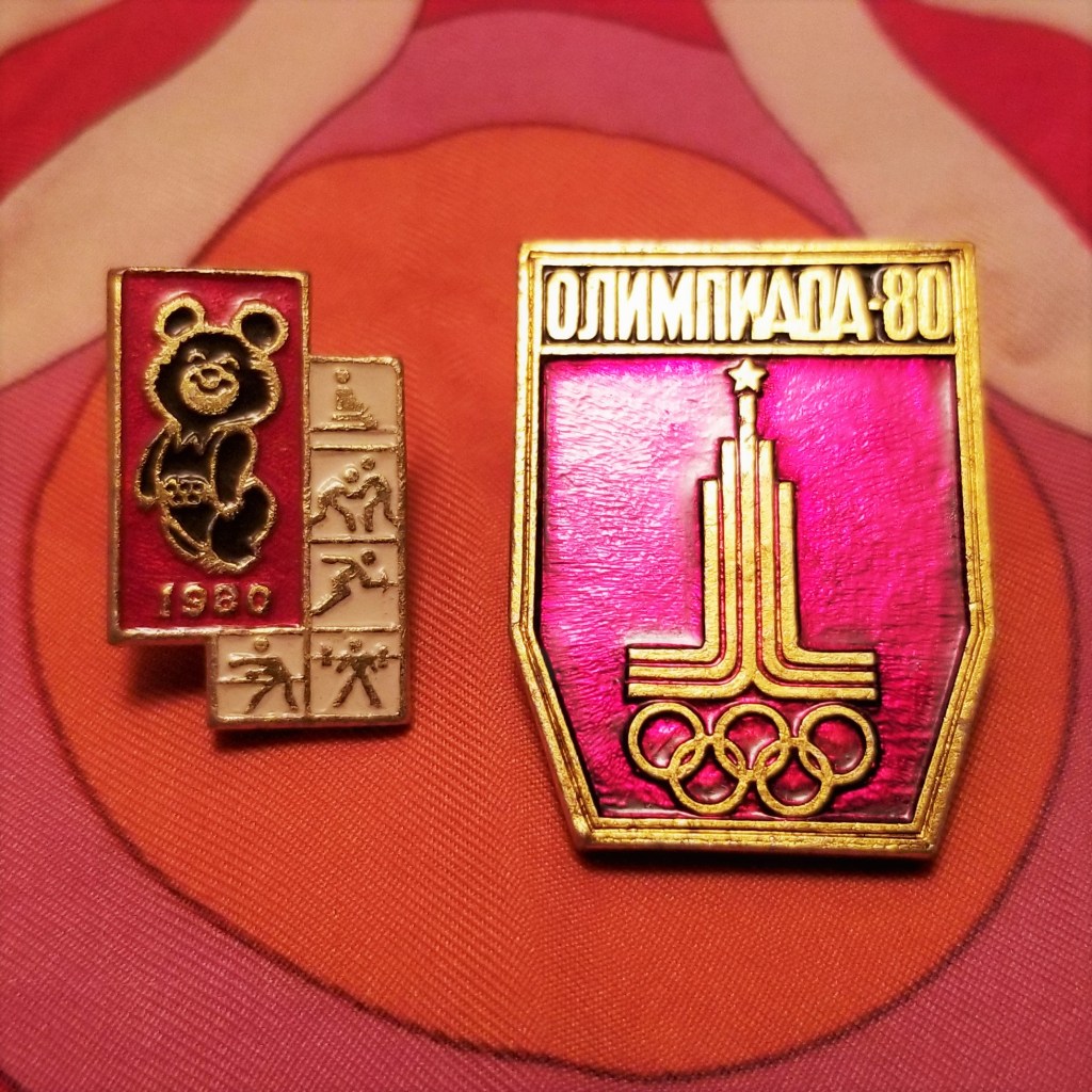 Official Olympic mascots appeared for the first time in the winter games that year (Grenoble 1968 offered Shuss, a little man on skis; his two-coloured head, which rested on a unique zig-zag flash-shaped foot, featured the Olympic rings). The first official mascot for summer games appeared in Munich 1972 with Waldi, a multi-coloured dachshund. In Montréal 1976, an unnamed black beaver with an Olympic rings detail in red was chosen; the symbolism came from its presence in Montréal’s coat of arms, as well as the idiom castor – beaver, because Kastōr and his brother Pollux, sons of Zeus, were the Greek gods of hospitality and athletes. I do not have any memorabilia from those games, but my sister was in Russia shortly after the Moscow 1980 games, and brought back several pins, like the two seen below: