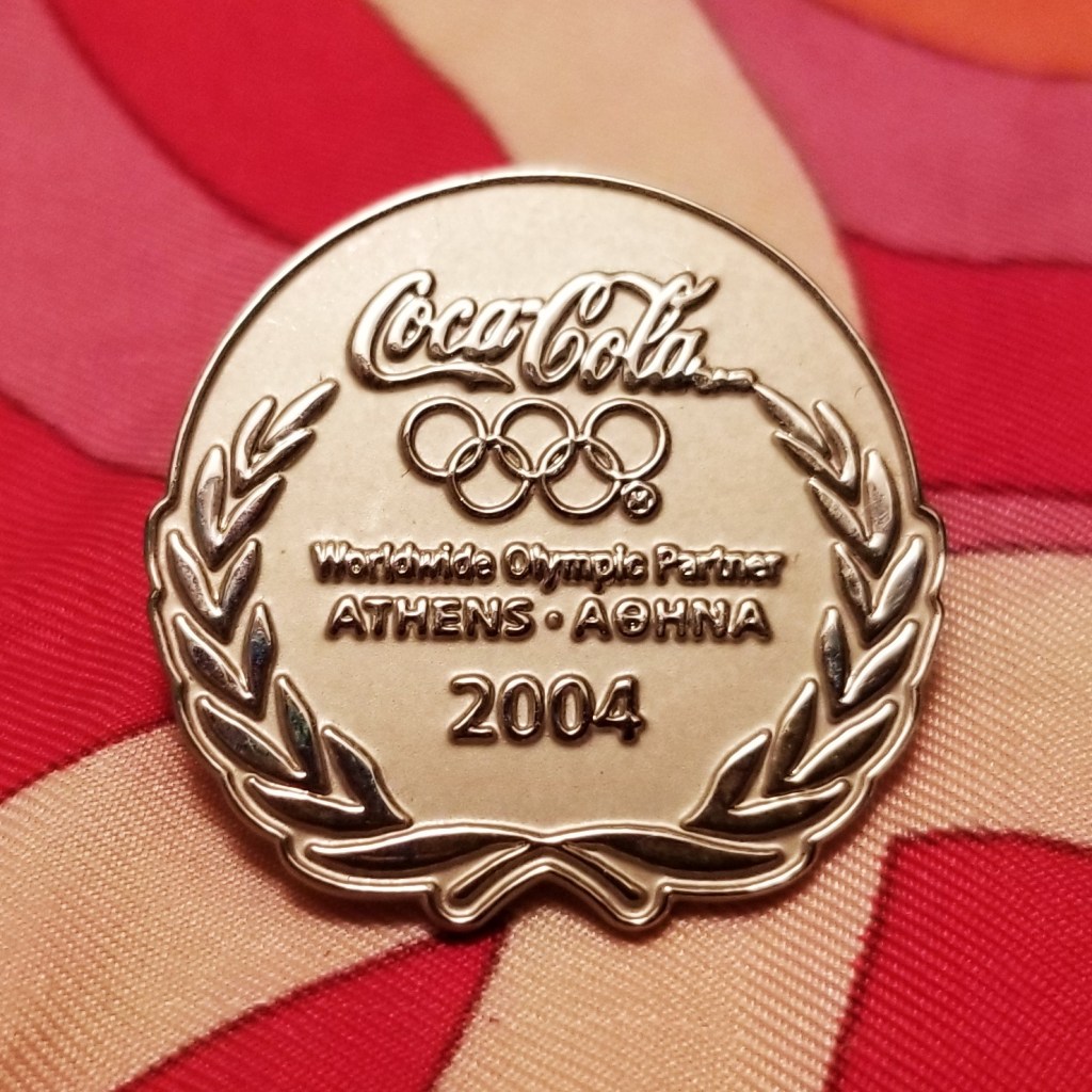 The Los Angeles 1984 games also marked a turning point in terms of sponsorship, having little public support and being the first games to be almost completely paid for with private money. Fast-forward to 2004, and my collection reflects that turn, with this clearly sponsored pin from Athens, that one of my husband’s aunts brought from a family visit in Cyprus and Greece that year: