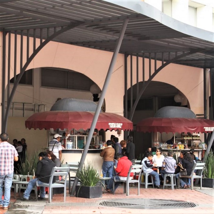 A local favourite are small restaurants specializing in Mexican sandwiches (torterÍas); two of the oldest torterÍas in Los Portales are: “La Barca”, founded in 1950, currently with a menu offering close to 50 different fillings (including chorizo, of course), and “La Vaquita Negra”, preparing tortas with a few choices, but mostly their famous “torta toluqueña”, since 1943. This classic, old-fashioned Mexican sandwich only requires a few ingredients: a crusty Mexican bun called telera, Mexican cream, fried chorizo (red or green), creamy unripened cheese“doble crema” – double cream, green salsa (raw or cooked), and sliced onions and tomatoes … no avocado, refried beans, or mayonnaise are allowed in the toluqueña!