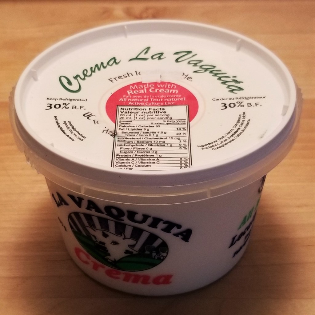 For my recipe, I baked a batch of teleras (photo below, left), but other crusty buns, such as Calabrese or Portuguese style would work. Mexican cream is a little tangy and very spreadable; there is a Canadian brand, coincidentally also called La Vaquita™ that makes Mexican style cheeses and cream, as shown below, right: