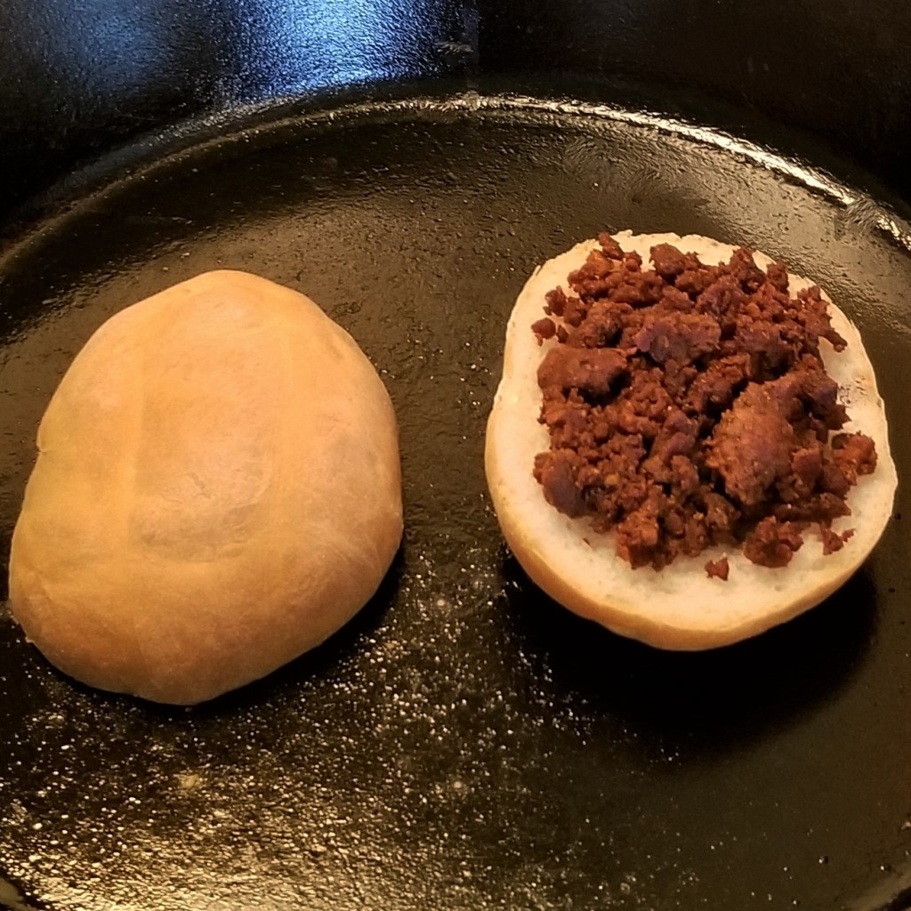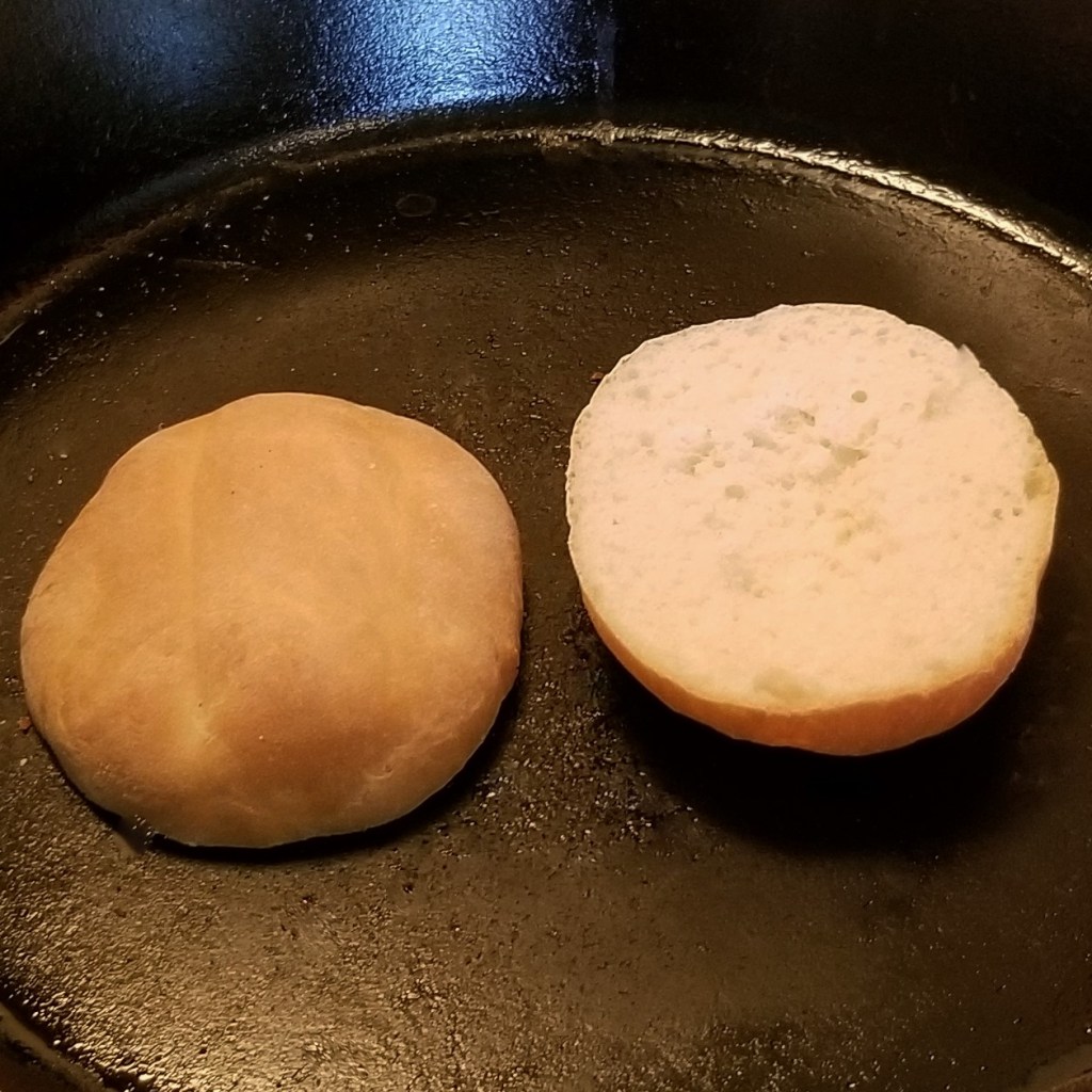 Slice the buns in half horizontally (photo below, left). Remove a little bit of the crumb from inside the top half, then place bread on a hot skillet over medium heat, cut sides facing down; after around one minute, flip the bottom half (photo below, right):