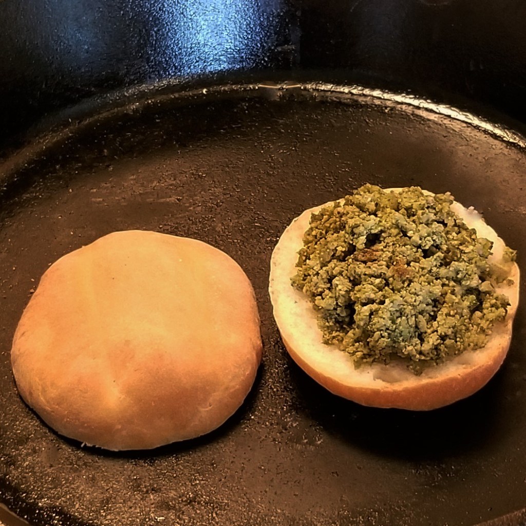 Scoop one quarter of the cooked chorizo on the bottom half. In the photos below, one bun with red chorizo (left) and one with green chorizo (right):