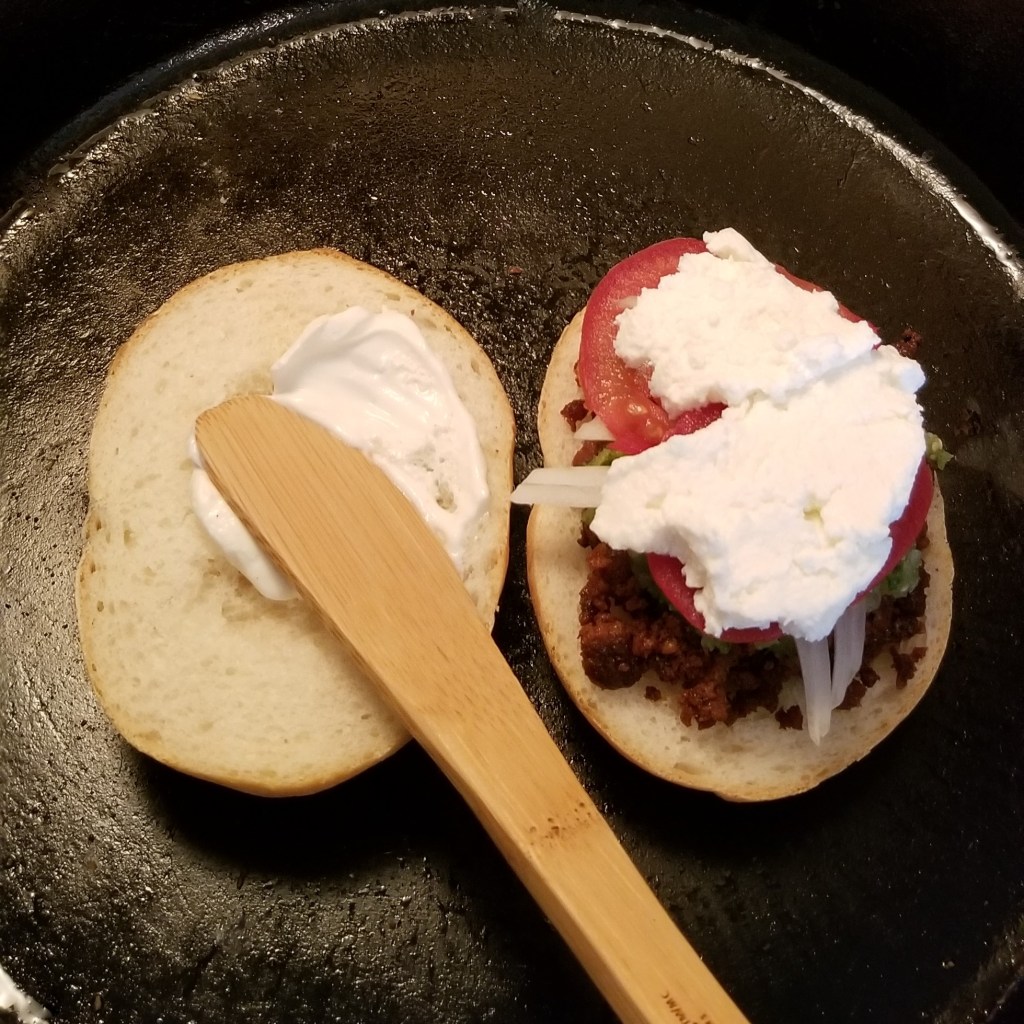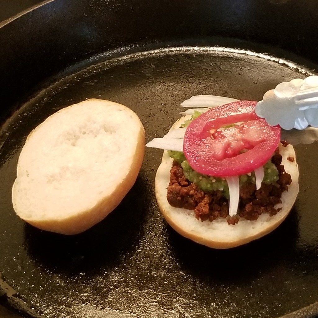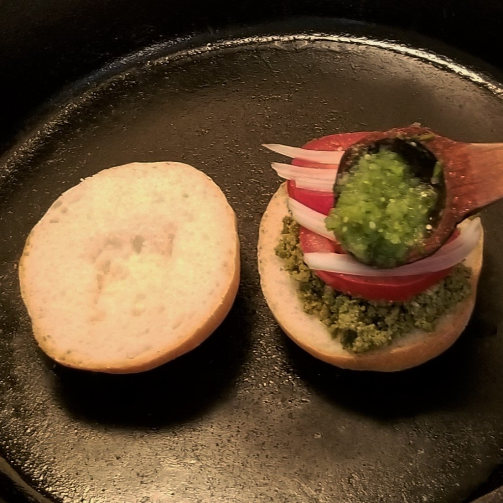 Flip top halves, to warm up the outer side, while topping chorizo, on the bottom half, with veggies and salsa. For contrast of colours, for the red chorizo I added green sauce first, then onions and finally tomatoes (photo below, left); for the green chorizo, I started with tomatoes, then onions, and ended with green salsa (photo below, right):