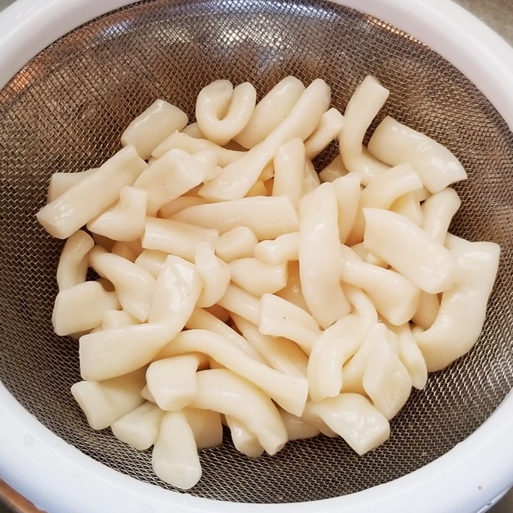Their chewy texture makes them a good vegan substitute for seafood such as clams, abalone, or as in this case, shrimp; this substitution also eliminates the spuddling job of peeling, cleaning, and slicing raw shrimp.