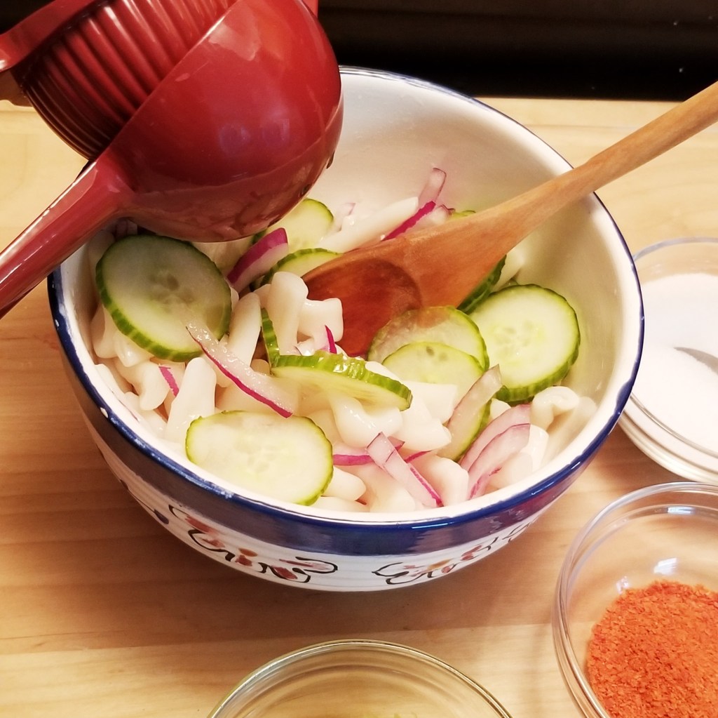 Add sliced onions, sliced cucumber, and squeeze in the juice from a half lime on top, mixing all together: