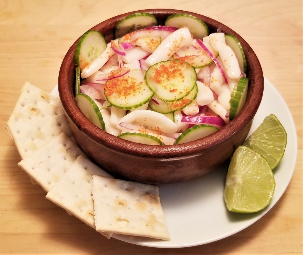 The green version (aguachile verde) usually calls for serrano peppers, while the red (aguachile rojo) could be made with ripe serranos, comapeños, chile de árbol, piquín, etc. The “hot pepper water” is traditionally prepared by grinding and mixing the ingredients in a molcajete (Mexican mortar); peeled and cleaned raw shrimp are then added, to partially cook them with the lime juice, and the dish is finished by adding sliced red onions and cucumbers. Aguachile is often served in a molcajete, even though in many cases nowadays, the aguachile juice has been actually processed in a blender.