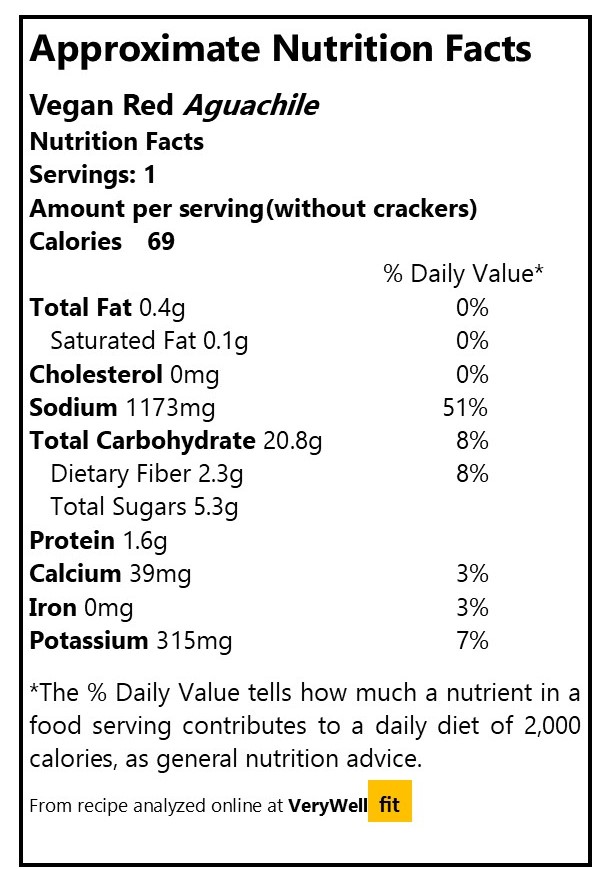 I got forgetful and did not include the crackers in the chart below, but five soda crackers amount to approximately 70 calories (about the same as the whole bowl of vegan aguachile!):