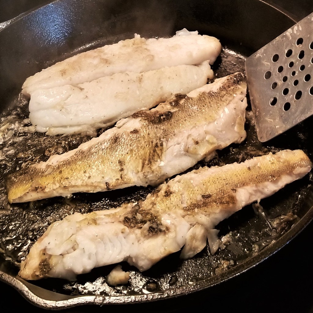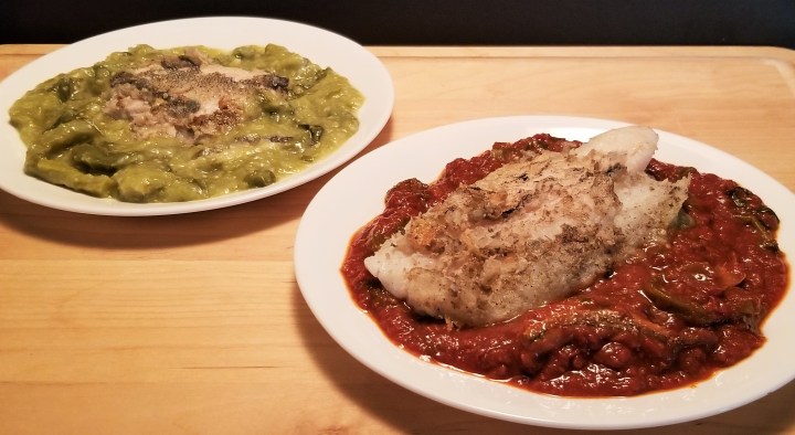 Right before serving, warm up two tablespoons of oil in a large frying pan over medium heat. Arrange fish filets (if skin on, skin side down), in a single layer, and cook for a few minutes, until flesh turns opaque (photo below, left). Flip fish and cook second side for a couple more minutes (photo below, right):