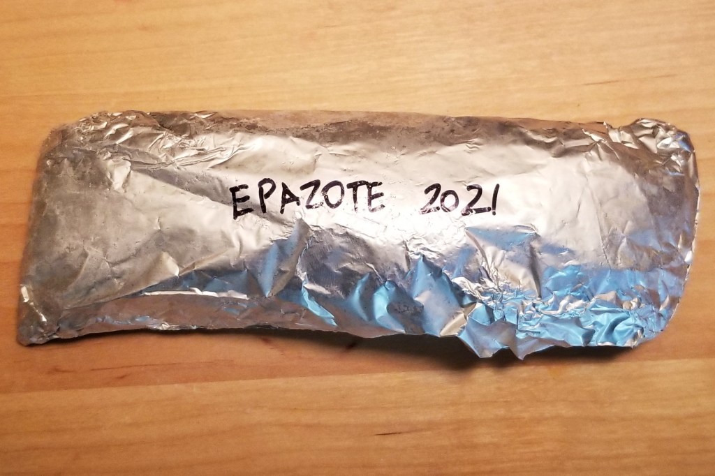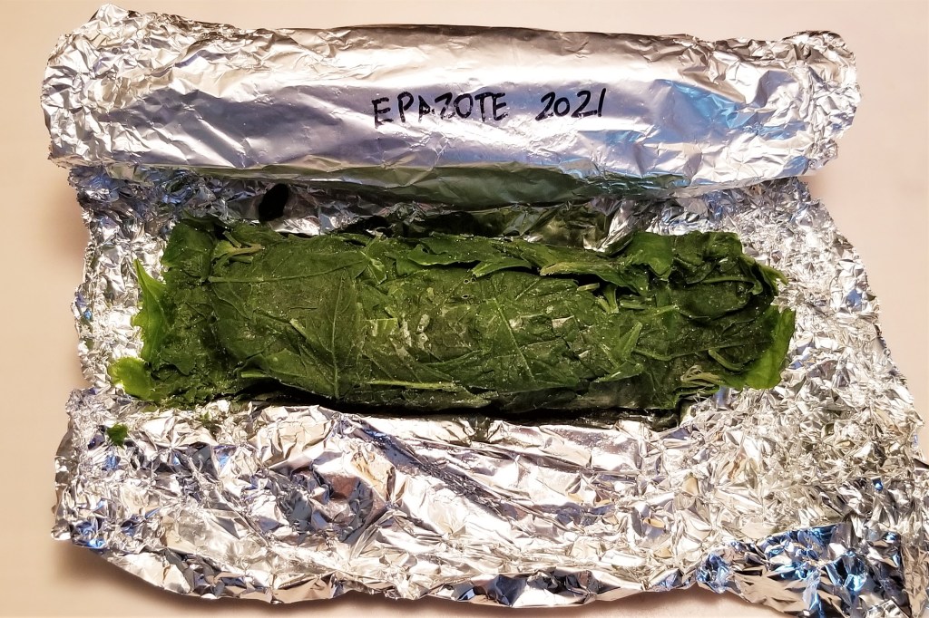 In a previous post, I explained how I preserve epazote from my backyard in the summer, by rolling fresh leaves into logs, then wrapping in foil before freezing (photo below, left). When needed, I simply unwrap the packet, and slice a piece of frozen herb (photo below, right), then I wrap and return the packet to the freezer: