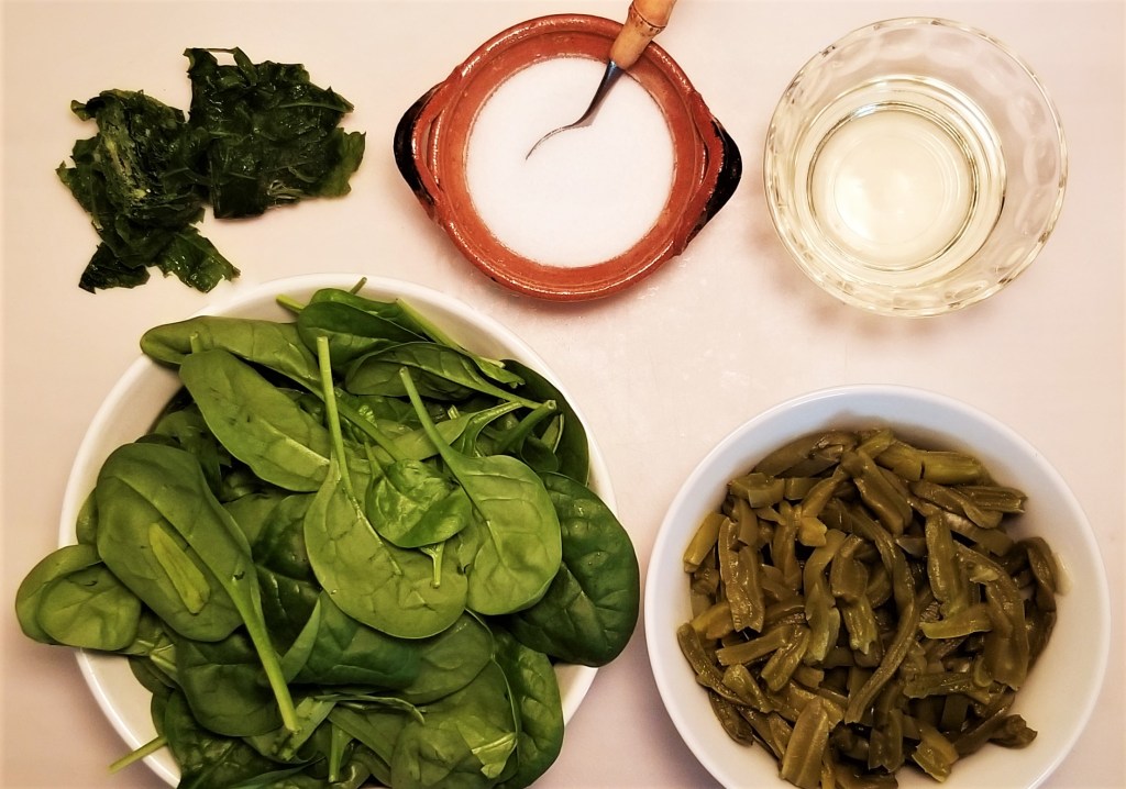 In the photo below, clockwise from top, left, epazote, salt, sunflower oil, cooked paddle cactus strips, and baby spinach: